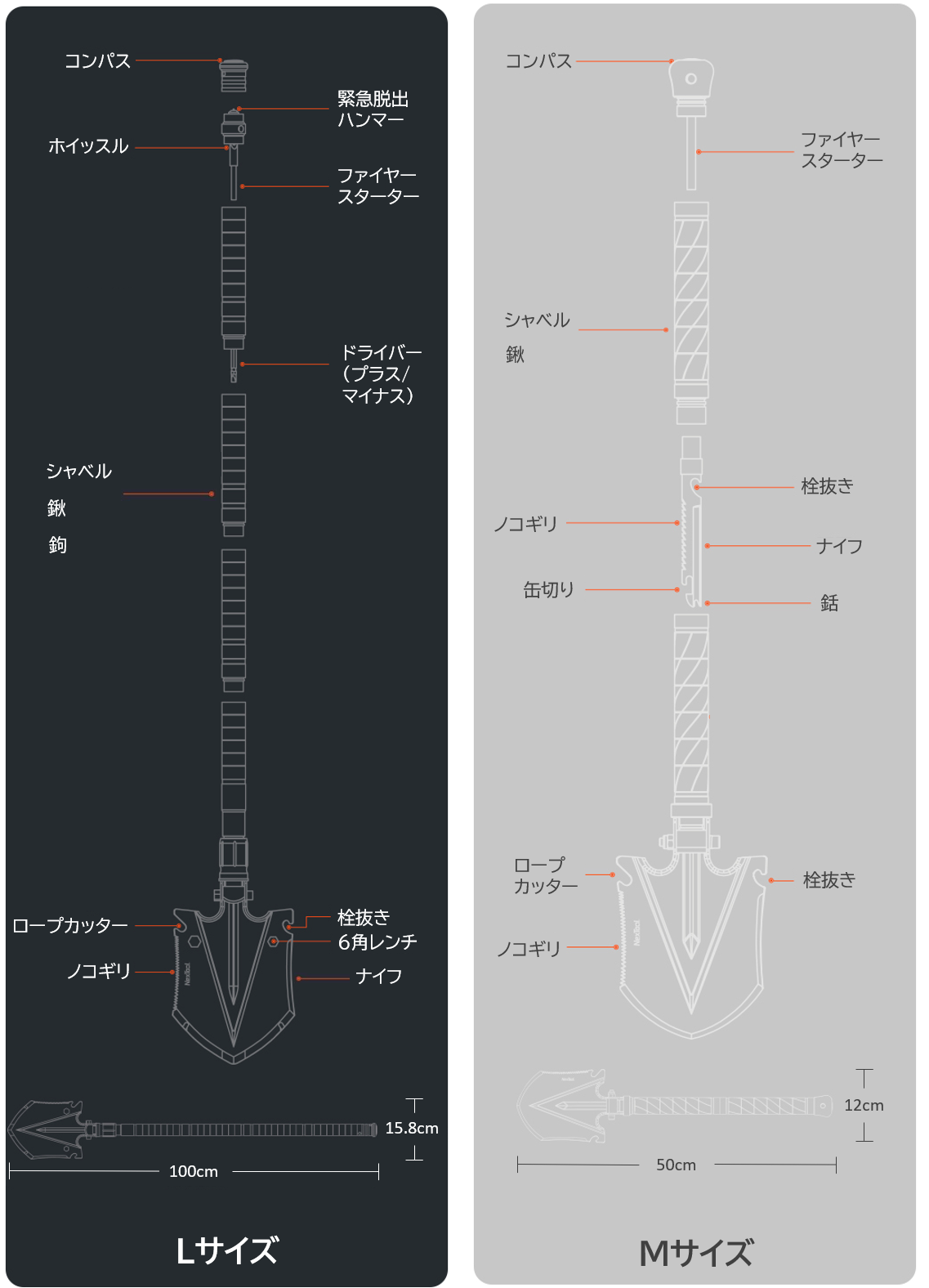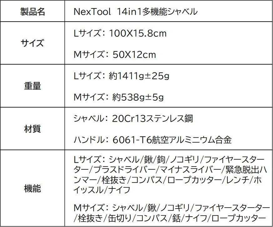 ページの冒頭でご説明している14機能、また動画に写っているシャベルはLサイズでございます。