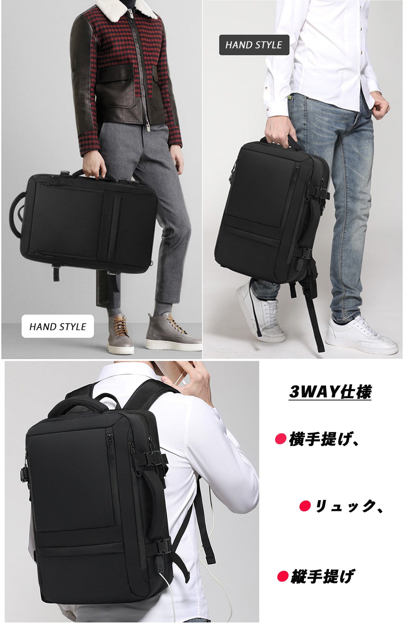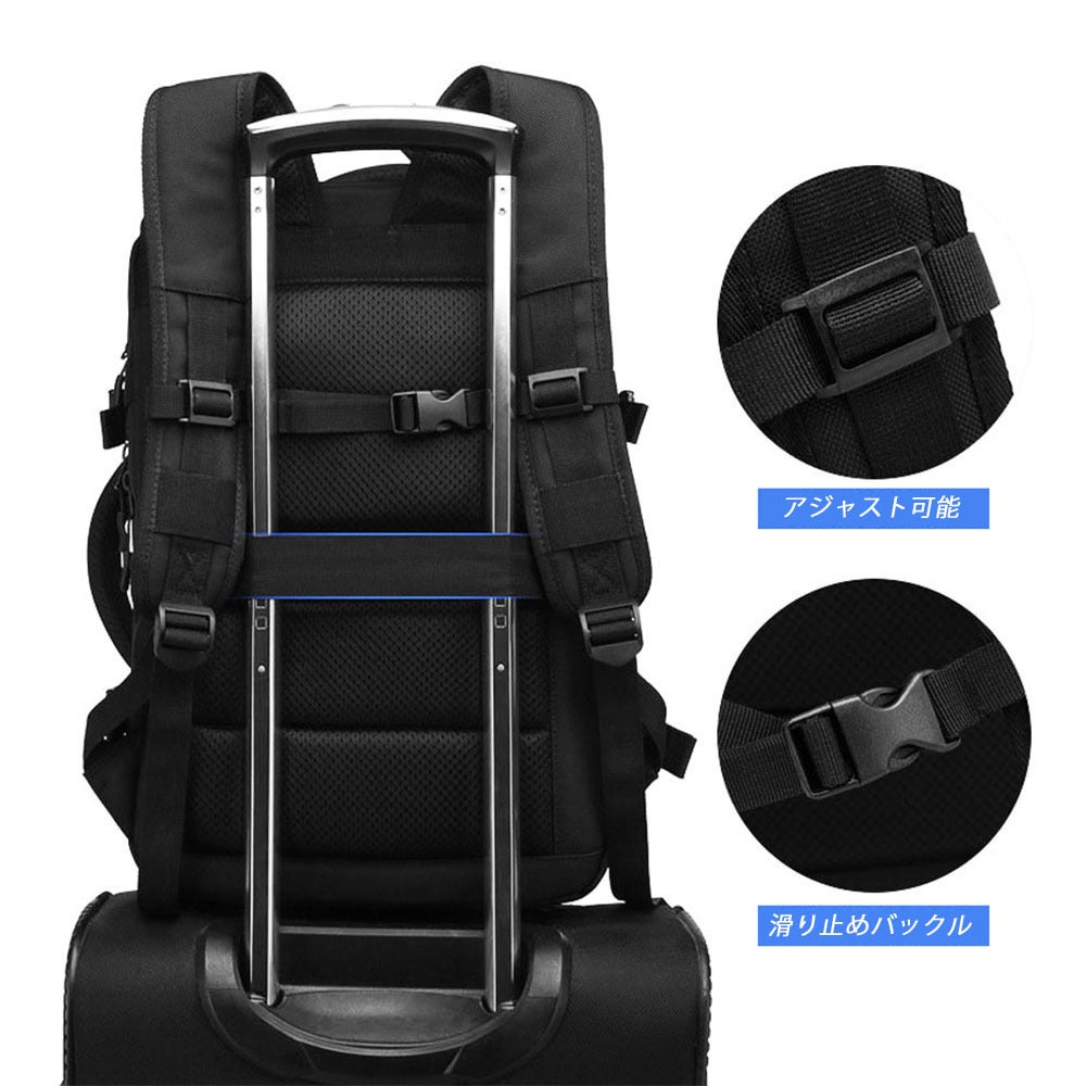 3WAY仕様(リュック、横手提げ、縦手提げタイプ)となっており、通勤 出張 通学 旅行 就職活動など様々なシーンに大活躍!旅行には欠かせないキャリーオン機能も搭載し調節可能なバックル付き、自分の身長に合わせます。