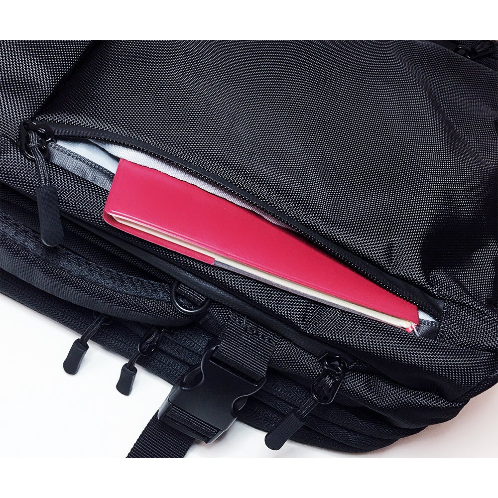 拡張機能による、右側下部にタブレットオープンポケットが付き、頻繁に出し入れ小物、(ノート、本など)も入れられる、