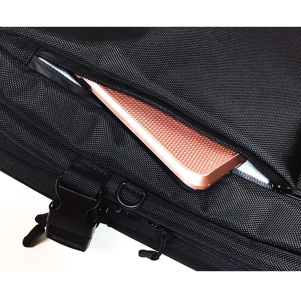 固定ベルト採用、キャリーオンバッグとして、スーツケースに固定でき、出張や旅行などで大変便利仕様となります。