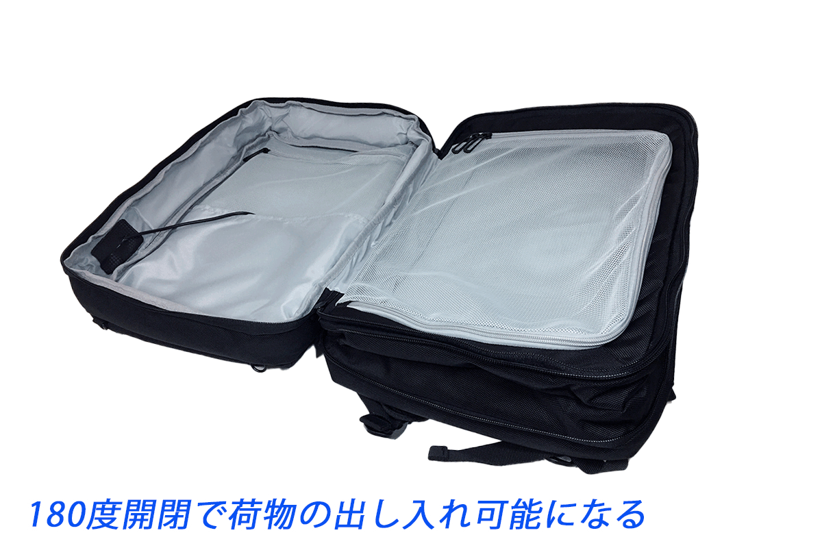 メイン収納ポケットは180度開閉で約20インチスーツケースの収納力があり、お着替、洋服などを収納できます、楽々出し入れは可能です!