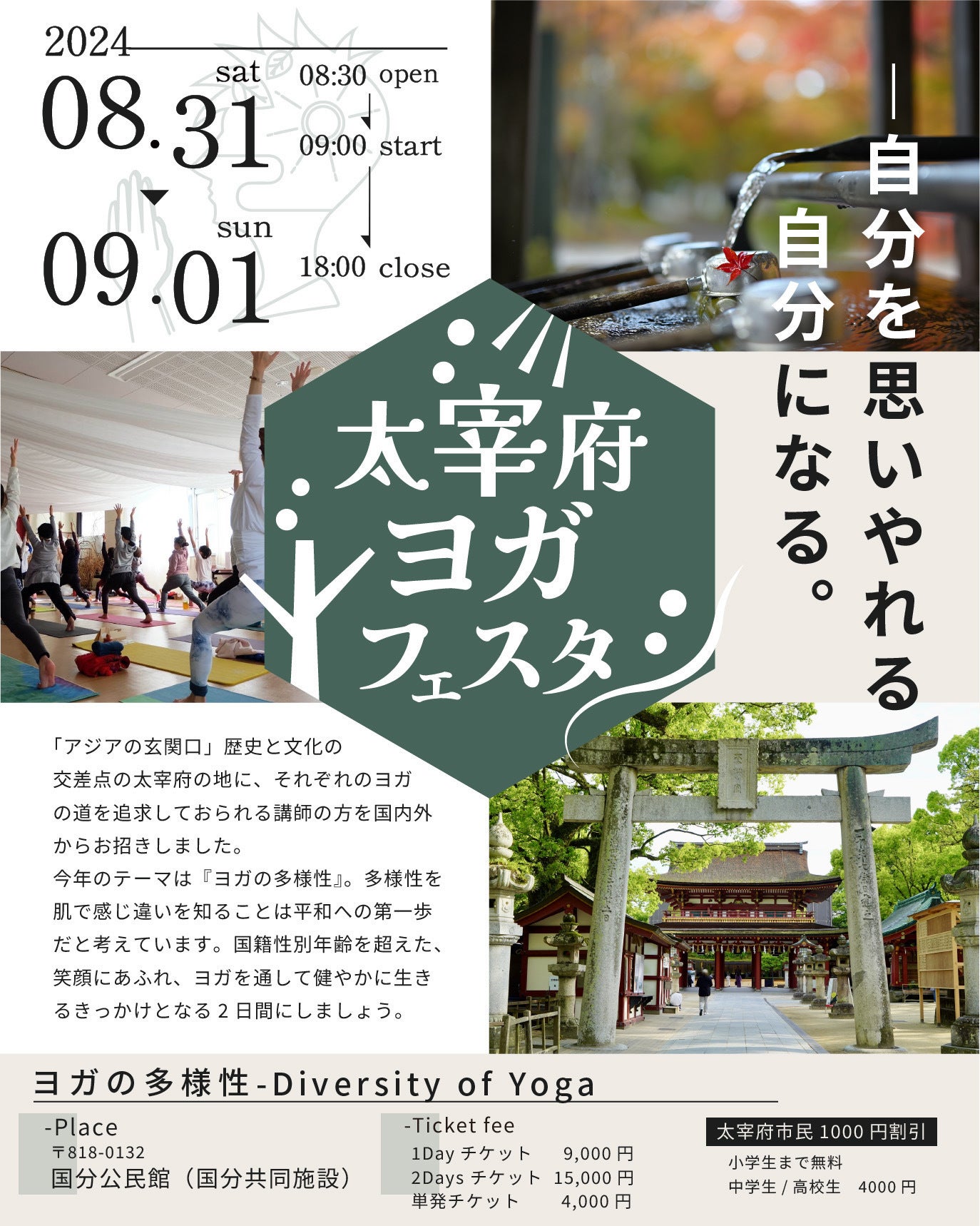 太宰府ヨガフェスタ開催まであと1ヶ月となりました。インドから帰国して僕が情熱を注いでいるイベントです。これまで出逢った中で沢山の人に知って欲しい先生達が太宰府に集結します。地元太宰府の地域の活性化やヨガを通して、自分の身体と心を見つめ『健康』や『人生』について考える時間になる時間を目指しています。↓↓↓-2024年-8月31日-9月1日-『太宰府ヨガフェスタ』”アジアの玄関口”歴史と文化の交差点の太宰府の地に、それぞれのヨガの道を追求しておられる講師の方を国内外からお招きしました。今年のテーマは『ヨガの多様性』多様性を肌で感じ違いを知ることは、平和への第一歩だと考えています。ヨガの奥深さに触れることで、ヨガの恩恵について認識を高める機会とするとともに、世界中の人々、一人一人が自分自身の体と心の健康について見直す日となるように考えています。熟練された講師陣から、yoga全般にわたって、心ゆくまでyogaの醍醐味を吸収できるチャンスとなります。“ヨガ”と“太宰府”それぞれの魅力をひとつに合わせ、人と街、そして文化が交わる感動を、このイベントからお届けいたします。国籍性別年齢を超えた笑顔にあふれ、ヨガを通して健やかに⽣きるきっかけとなる2日間になればとの思いです。ご参加を心よりお待ちしております。主宰 渡邉翔太—————【1日目】8月31日(土)8:30 会場オープン 受付開始9:00 開幕式 フルート二重奏 熊抱ひかりさん・阿部舞さん9:30-10:45 Gagan先生 通訳 岸上和先生『HEALTH FOR EVERYONE』11:15-12:30 冨岡和代先生 『ヨガニードラとサンカルパ』12:30-14:30 昼休憩 13:00-14:00【音楽Live】14:30 -15:45 家入有美先生『みんなでチェアヨガ』16:15-17:30 トベセイイチロウ先生 『ポーズの仕組みの理解とハタヨガ的サーダナへの準備 】 ~基本的ポーズにある奥行きの体験〜18: 00 写真撮影 解散【夜のヨガフェスタ】20:00 -20:15 シタール演奏 若林忠宏さん20:15-21:00 キールタン21:00-21:30リラックスヨガ 渡邉翔太21:30-22:00 クリスタルボウル演奏 山本香苗先生参加費-2000円(チャイ&焼き菓子付き)【2日目】9月1日(日)【早朝パークヨガ】7:00-8:00 国分寺跡遺跡早朝ヨガ筑前国分寺伝薬師如来像(重要文化財)参拝参加費-2000円(パン&コーヒー付き) 8:30 会場オープン 受付開始9:00-9:00 開幕式 シタール演奏 若林忠宏さん9:30-10:45 渡邉翔太先生 『Sivananda Yoga -静と動-』11:15-12:30 祐成美穂先生 『明日への破壊』 12:30-14:30 昼休憩 13:00-14:00【音楽Live】14:30 -15:45 サントラ先生『からだの声を聴いてヨガ!』16:15-17:45 緒方英子先生 『ヨガの練習から得るコミュニケーション力』18:00 写真撮影 解散※はじめての方、シニアの方でも年齢問わず安全に取り組めるようにサポートスタッフがいます。——————【参加講師-登壇順-】-Gagan(インド)-冨岡和代(淡路島)-家入有美(大阪)-トベセイイチロウ(福岡)-山本香苗(福岡)-渡邉翔太(太宰府)-祐成美穂(福岡)-サントラ(柳川)-緒方英子(別府)【音楽Live 】※1日/2日チケットの方は無料■1日目-13:00-14:00-エイサー演舞 琉球の風 真心トランペット演奏 白水 泰■2日目-13:00-14:00-音楽教室LALAシンフォニー代表 野中朋子ファゴット奏者 重松真央 ピアニスト 川﨑美香【お弁当注文】(別途1000円)1日目 ランチボックス(太宰府草の家)2日目 ランチボックス(BAR TiTiHaHa)【施術体験会】1日目 こうじや整骨院(太宰府)2日目 にのみや整骨院(太宰府)■デザインSuzuki Kazutomo(三重)■映像制作茨木琢己(東京)■企画渡邉翔太【場所】〒818-0132 国分公民館(国分共同利用施設)【駐車場】筑前国分寺(当日は駐車場スタッフがいます)【参加費】1日目 9000円2日目 9000円2Day チケット 15000円単発クラス 4000円【太宰府市民1000円割引】【講師紹介1000円割引】—————【銀行振り込み】ゆうちょ銀行店名 七四八(読み ナナヨンハチ店番 748 普通預金口座番号 9402659渡邉翔太【キャンセルポリシー】 1ヶ月前まで:キャンセル料なし 1週間前までキャンセル:料金の50% 当日キャンセルや無断キャンセルの場合:料金の100%【申し込み】先着50名 ※残席15名です申し込みフォーム↓↓https://forms.gle/UWswQhHCY4T6qGZe6【お申し込み期限】 -7月31日21:00-場所:国分共同利用施設期間:8月31日(土)〜9月1日(日)時間:2日間09:00〜18:00ーーーーーーーーーーイベント詳細は下のリンクをタップ▼▼https://note.com/1218928/n/nf4ad980d3730?sub_rt=share_pbーーーーーーーーーー【問い合わせ】太宰府ヨガフェスタ代表 渡邉翔太(わたなべしょうた)wadakunn121844@icloud.com