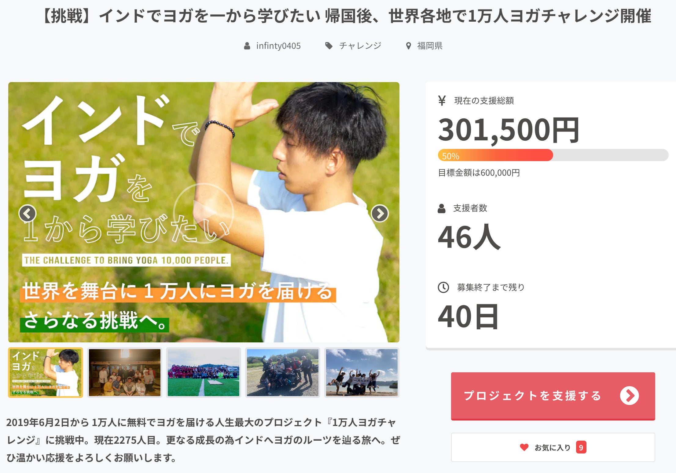 【50%突破 ご支援ありがとうございます】みなさん、沢山の応援を本当に有難うございます!期限は2/18までです。『インドでヨガを一から学びたい。帰国後世界各地で一万人ヨガチャレンジ開催』遂に、目標達成率50%を突破しました。応援して頂いた皆様、心より感謝申し上げます。目標達成へ、今一度応援のほどお願いします。皆さんの力を貸してください!!!引き続き応援、拡散よろしくお願い致します。wadakunn121844@icloud.comホームページhttps://thanks-yoga.com/