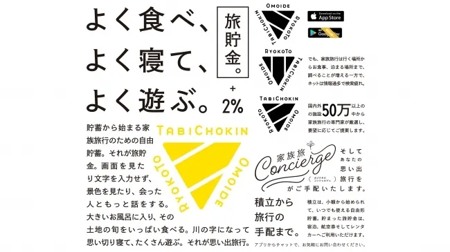 2019/05/29 12:40株式会社ファーストスウェル(本社:神奈川県鎌倉市、代表取締役:池田誠一郎)は、日本で初めて、旅行を目的とした自動積立アプリ「TABI CHOKIN(旅貯金)」の提供を、2018年8月に開始しました。そしてこの度、ブランドデザインを手掛ける「Tide Cowboys(タイドカウボーイズ)」協力のもと、積立に加えて、新サービス・家族旅行のチャット相談と手配ができるアプリ「思い出旅行と旅貯金」として刷新。ロゴ、ホームページ、UIデザインも新しくなった本アプリが、5月20日よりiOS版にて配信開始!本アプリは、お客様が、旅行資金を自動で積み立てることができるアプリです。旅行の予定にあわせて目標額と満期時期を自由に設定でき(※1)、積立額と2%のサービス額を合わせた”旅貯金”を、宿泊、航空券やレンタカーの手配にご利用いただけます(※2)。最大の特長は、積立期間に関係なく2%のサービス額が積立額に付与されること。来年の旅行のためにコツコツ貯めるのも、来月の旅行のために一括でも、2%のサービス額が付与されるので、低金利時代に大変お得な積立アプリです。今回加わった新サービスは、家族旅行の専門家「家族旅コンシェルジュ」が、“旅育”に最適な宿泊先はもちろん、行先やアクティビティ、食事など、旅行計画の相談を気軽にチャットで応対し、予約手配まで行う「思い出旅行相談」サービスです。旅行代理店での待ち時間や、ネットで検索・予約する時間を省けるので、子育てに仕事にと忙しいママとパパでも、隙間時間に気軽にチャットで相談可能です。今後も、株式会社ファーストスウェルは、大切な家族旅行を、お得に、便利にそして特別な思い出になるよう「思い出旅行と旅貯金」のサービス拡充を目指します。※1.目標額は1万円から、上限100万円の積立・一括入金が可能です。※2.現金での払い戻しはできません。■「思い出旅行と旅貯金」サービス特長1.家族旅行の専門家「家族旅コンシェルジュ」にチャットで無料相談育児に家事、そして仕事に忙しく、旅行の計画をする時間がない、“旅育”ってどこに行けばいいの?と悩まれているご両親は多いと思います。そこで、本アプリ上では、これまで旅行業で培った専門スタッフが「家族旅コンシェルジュ」として、チャットにて無料相談を承ります。旅行代理店への来店や待ち時間、ネットの検索・予約の時間を省き、家事や仕事の合間でも気軽に相談できます。2.家族旅行に最適な宿泊施設を厳選してご案内家族でご利用された方の口コミや、家族でくつろげる広いお部屋やお風呂などを考え、独自の基準で厳選した、国内・海外の宿泊施設をご提案します。国内線・国外線航空券、レンタカーも合わせてご手配可能です。※現在、新幹線のご手配はできません。3.始めてすぐに、積立額+2%が”旅貯金”に!自分のペースでお得に旅行積立積立期間に関係なく、始めてすぐにサービス額2%が付与されるのが特長です。積立の途中で旅行に利用することや、積立期間の変更もいつでも可能です。また、積立目標額を自由に設定でき、積立だけではなく、一括のクイック積立も可能です。積立目標額に応じて、毎週一回クレジットカードから自動積立されるので、忘れることなく旅行資金が貯まり、さらにクレジットカードポイントも同時に貯められます。 【アプリ操作方法】目的や期間、旅行者の情報などを入力すると、「思い出旅行相談」のチャット画面で「旅コンシェルジュ」に自動相談 ※入力しなくても可「旅貯金」画面から、クレジットカード情報を入力目標額と期間を設定すると、毎週一回クレジットカードから自動的に積立旅行手配の時には、再度「家族旅コンシェルジュ」にチャットで相談 もっと見る