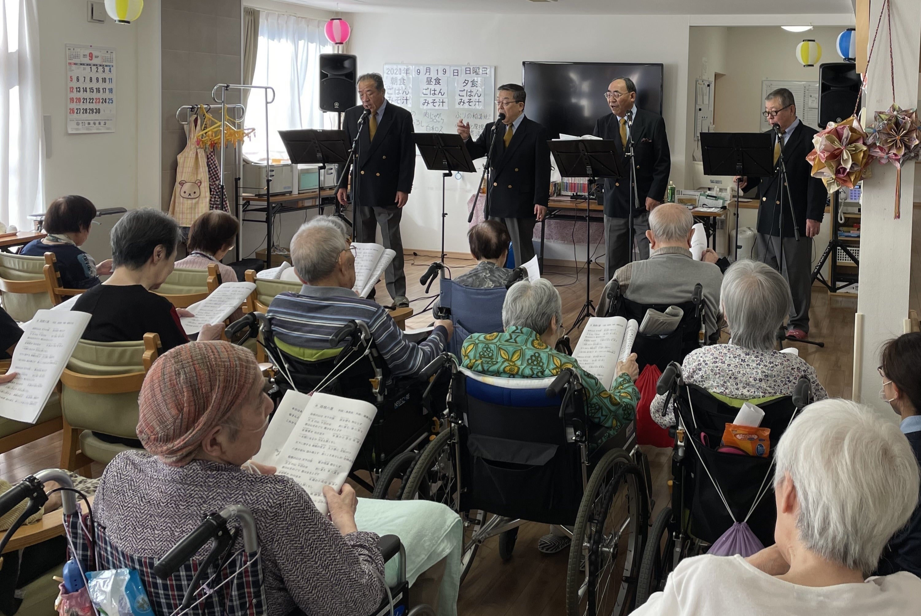 私たちのレパートリーは「学生時代」「浜辺の歌」など、誰でも一度は耳にし、口ずさんだことがある曲ばかり。高齢者福祉施設では、みんなで楽しく合唱するうちに、利用者の方々が、元気になる様子を何度となく目のあたりにしてきました。