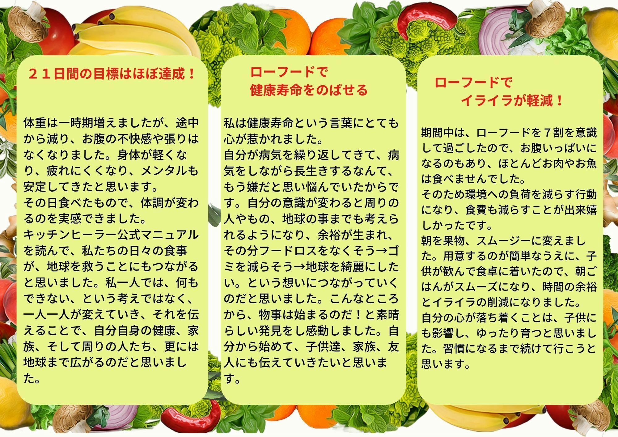 家族の健康はもちろんですが、現在社会で起こっている様々な問題、フードロス、プラスティック問題、地球の資源、食品添加物、農薬など、少し気を付けることで、家族の健康が守れ、医療費の削減や健康長寿にもつながり、それが地球を守ることにもつながるでしょう。