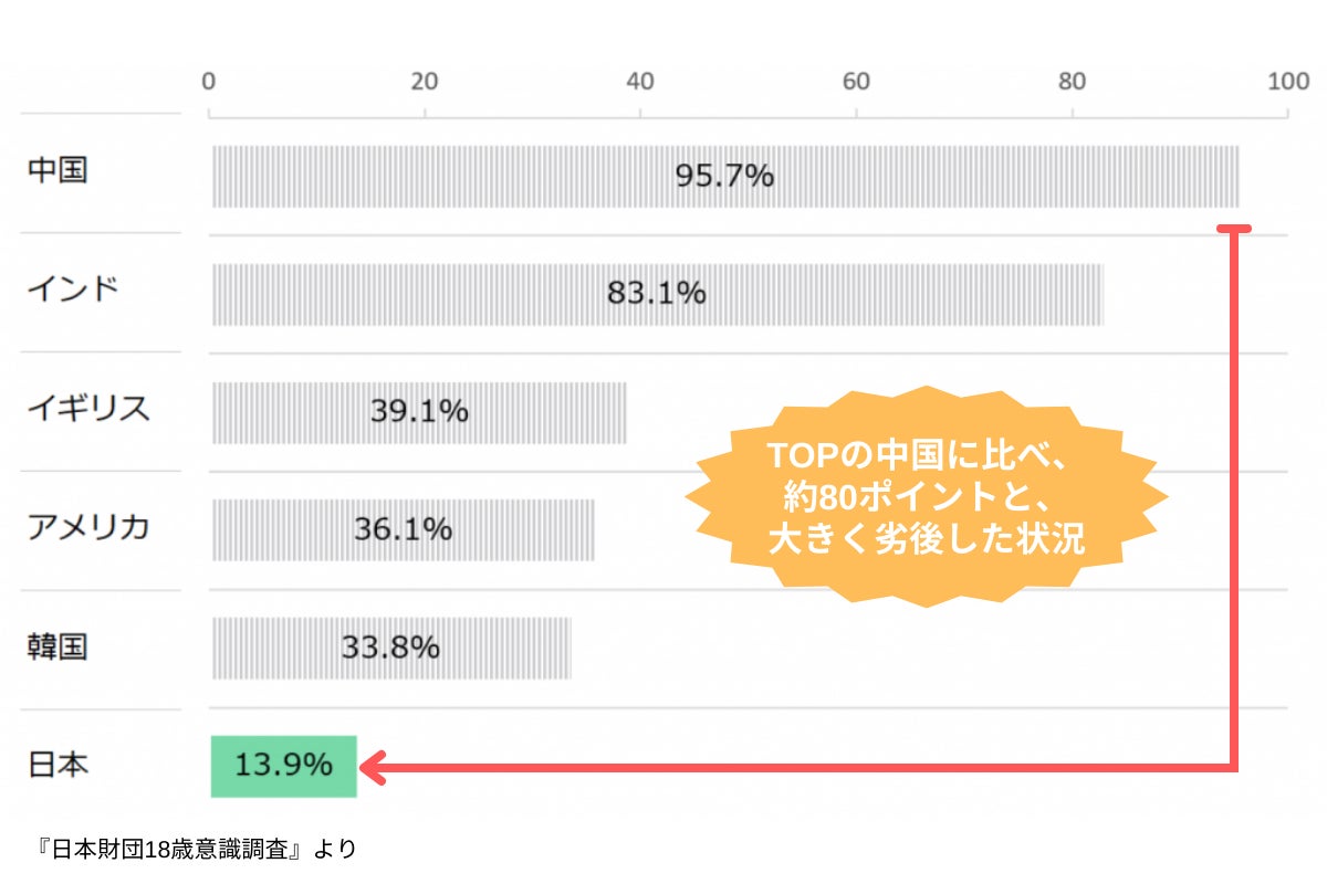 2022年3月に日本財団より、『日本財団18歳意識調査「成人年齢引下げ」「国や社会に対する意識6カ国比較」についての調査結果』が発表され、日本・米国・英国・中国・韓国・インド6カ国の若者に比べ、自国の将来に対して非常にネガティブな印象をもっているという厳しい現状が確認されました。