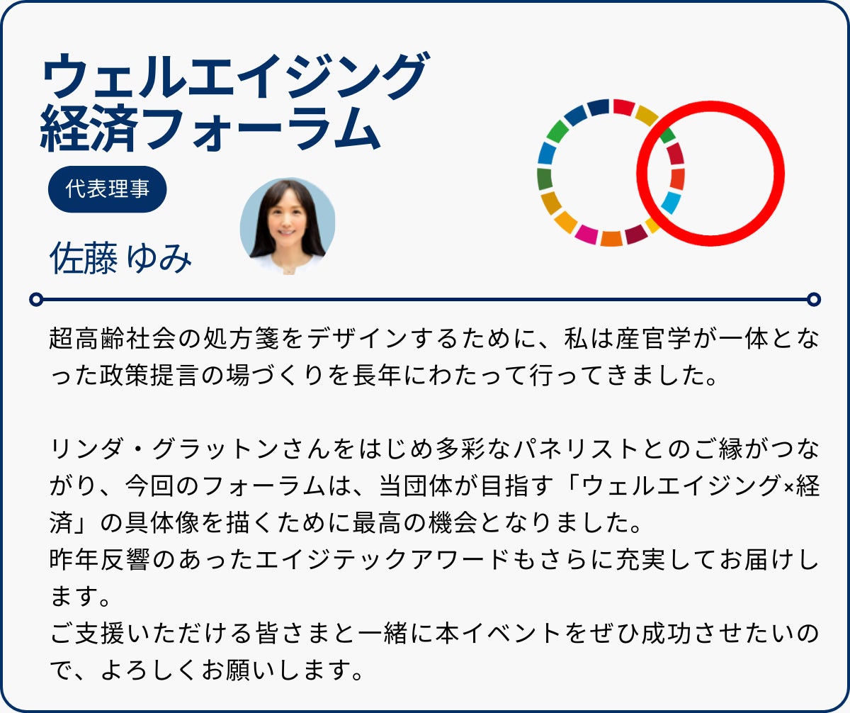 このフォーラムを通じ、「ウェルエイジングマインド」および「ウェルビーイング&エイジテックのスタートアップマインド」を一気に高めることを目指しています。