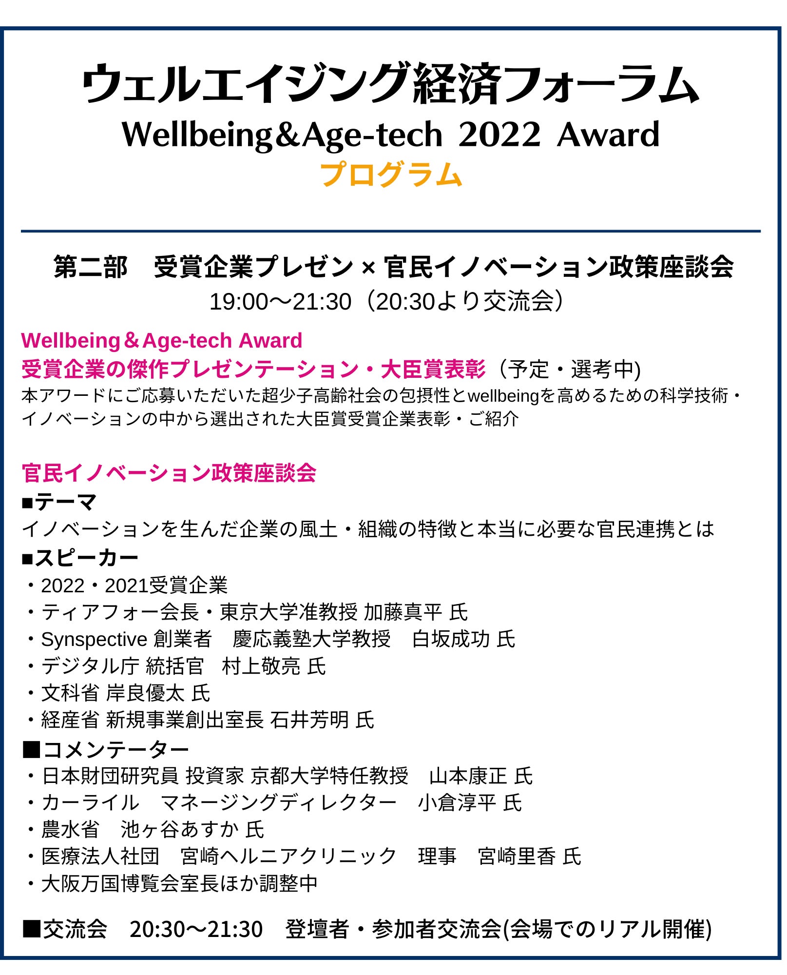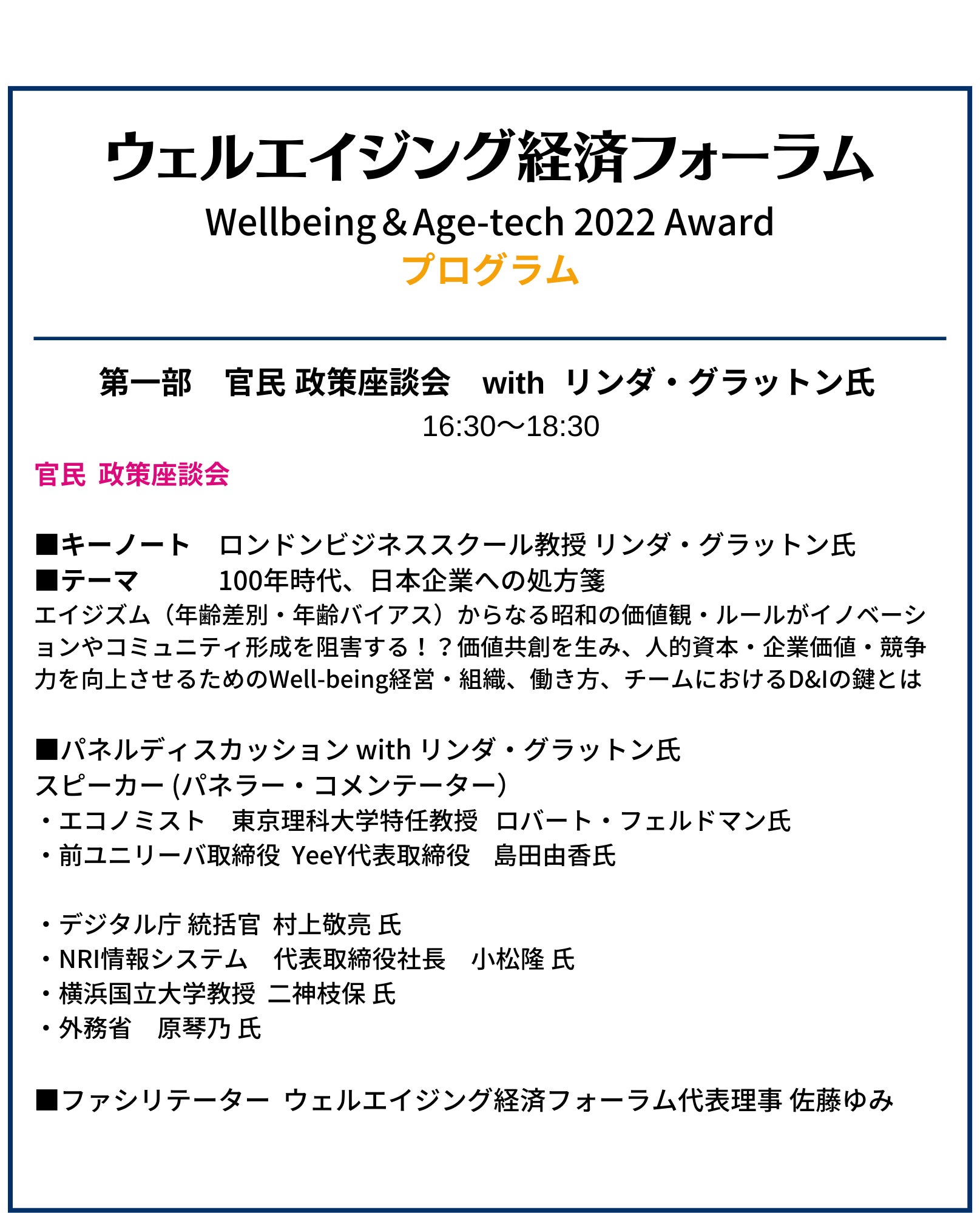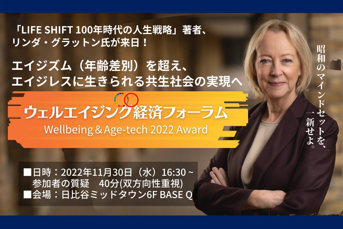 2022年はこれまでの取り組みをより一層推し進めるべく、LIFE SHIFTの著者であるリンダ・グラットン氏をフォーラムに招聘し、官民政策座談会および「ウェルビーイング&エイジテック」スタートアップの表彰を実施します。
