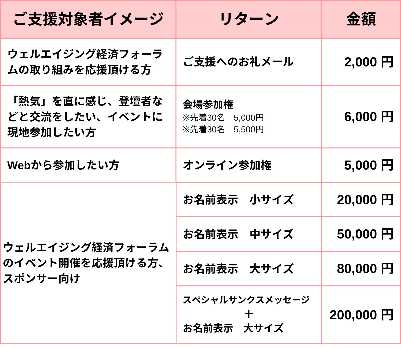 ウェルエイジング経済フォーラムの実施をご支援頂ける方に、イベント実施時のお名前掲示や講演会チケットなどのリターンを用意しています。