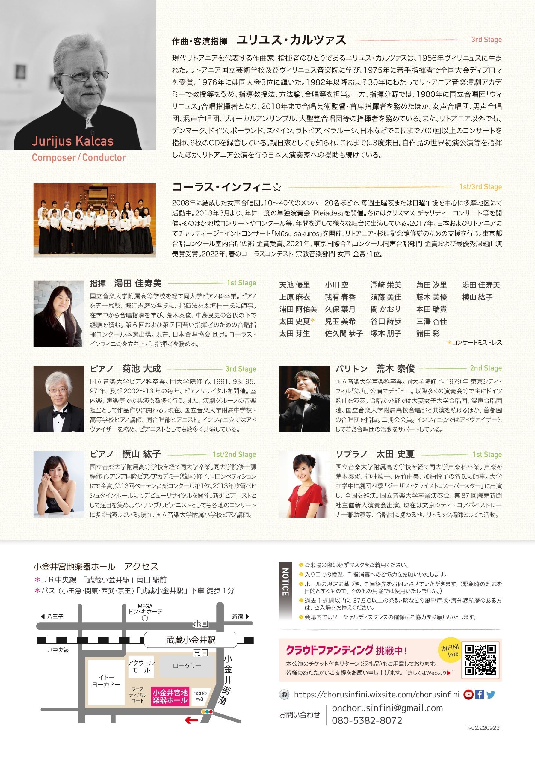 「リトアニアを代表する指揮者作曲家ユリユス・カルツァス氏の4回目の来日が実現、コーラス・インフィニ☆委嘱作品を指揮します。ユリユス・カルツァス作品展と題して、歌曲集『夏の夜』の日本初演や女声合唱のための小品もお聴きいただきます。多くの関心を集めながらも、いまだに未知のヴェールの先に拡がる北欧の声楽曲。その、時に熱く時に繊細な佇まいにどうかご期待ください。」