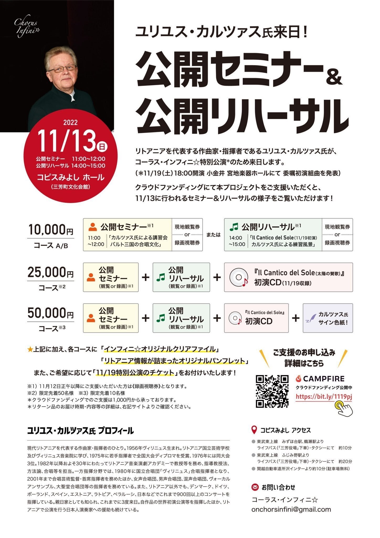 皆様の温かいお気持ちに支えられ、 ついに特別公演2日前となりました!クラウドファンディングは【本日23:59で終了】となります。このクラウドファンディング企画は、インフィニ☆として初めての取り組みであるにも関わらず、たくさんの方にお気持ちを寄せていただきました。感謝の気持ちとともに、本番に向けて身の引き締まる思いです。皆様をお迎えするために、できる限りの準備をしてまいります。ご支援いただいた皆様へリターンのうち、チケットを選択していただいた方へは、整理番号を順次メールにてご案内しております。明日18日中にお送りする予定ですので、まだメールを受信されていない方は今しばらくお待ちください。4年の時間をかけて培った絆が奏でる音を、お客様に手渡せる日がすぐそこまで迫っています。待ち望み、待ち焦がれた日。世界初演の記念すべき瞬間をここまでお読みいただいた皆様と共有できたなら、それほど幸せなことはありません。コーラス・インフィニ☆が全身全霊でお届けする「太陽の賛歌」、ぜひ客席でお聴きください。