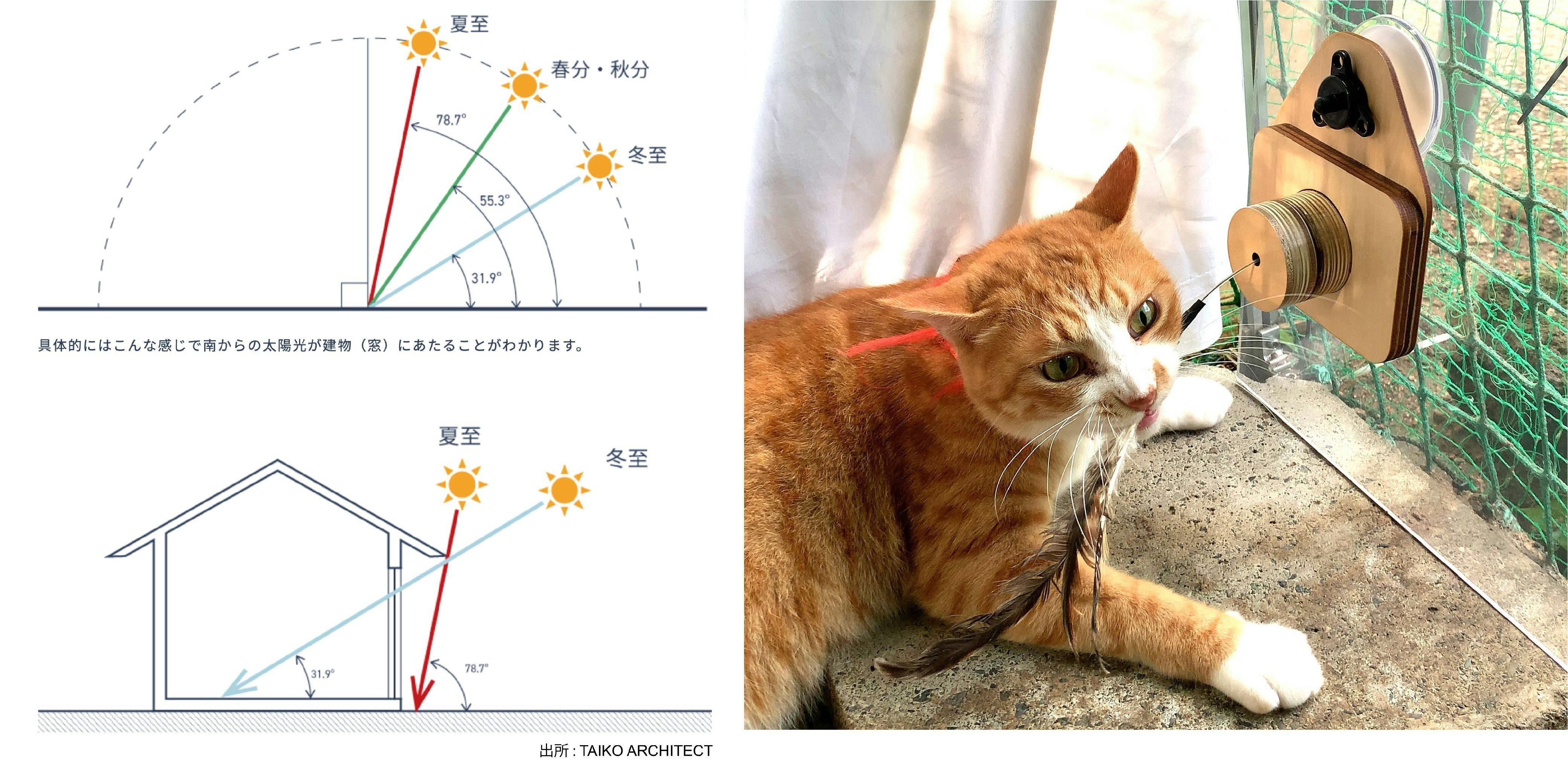 本日は、太陽光の角度のお話をしたいと思います。皆様も小学生の時に理科の授業で習ったと思いますが地球は地軸が23.4度傾いており、太陽の周りを周る公転をする際にこの傾きのせいで太陽光が地球に当たる角度が季節により違います。冬場は太陽高度が低く、より部屋の奥まで太陽光が届きます。体感的にも真夏は頭の真上が暑いですよね。秋から春にかけては「まどじゃらし」もより効果的にご使用いただけます。(夏場の直射日光が当たらない状態でも稼働しますのでご安心ください。)当製品が冬場の日向ぼっこをしている猫のお役に立てたら幸いです。