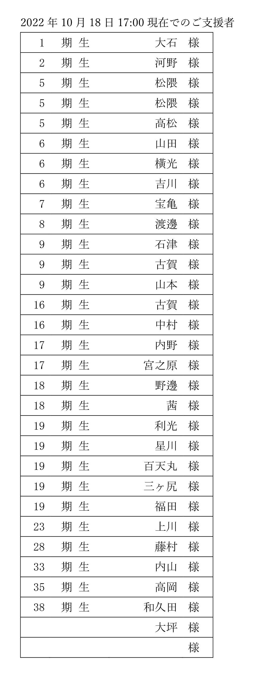 さて、プロジェクトページに掲載していた通り、10000円以上のご支援をいただいた方について、支援者様一覧を掲載させていただきます。(期生以外の記載順は順不同でご了承ください。)10月18日17:00時点での情報です。今後、新たにご支援いただいた方につきましては、新しく一覧表に追記させていただく予定です。