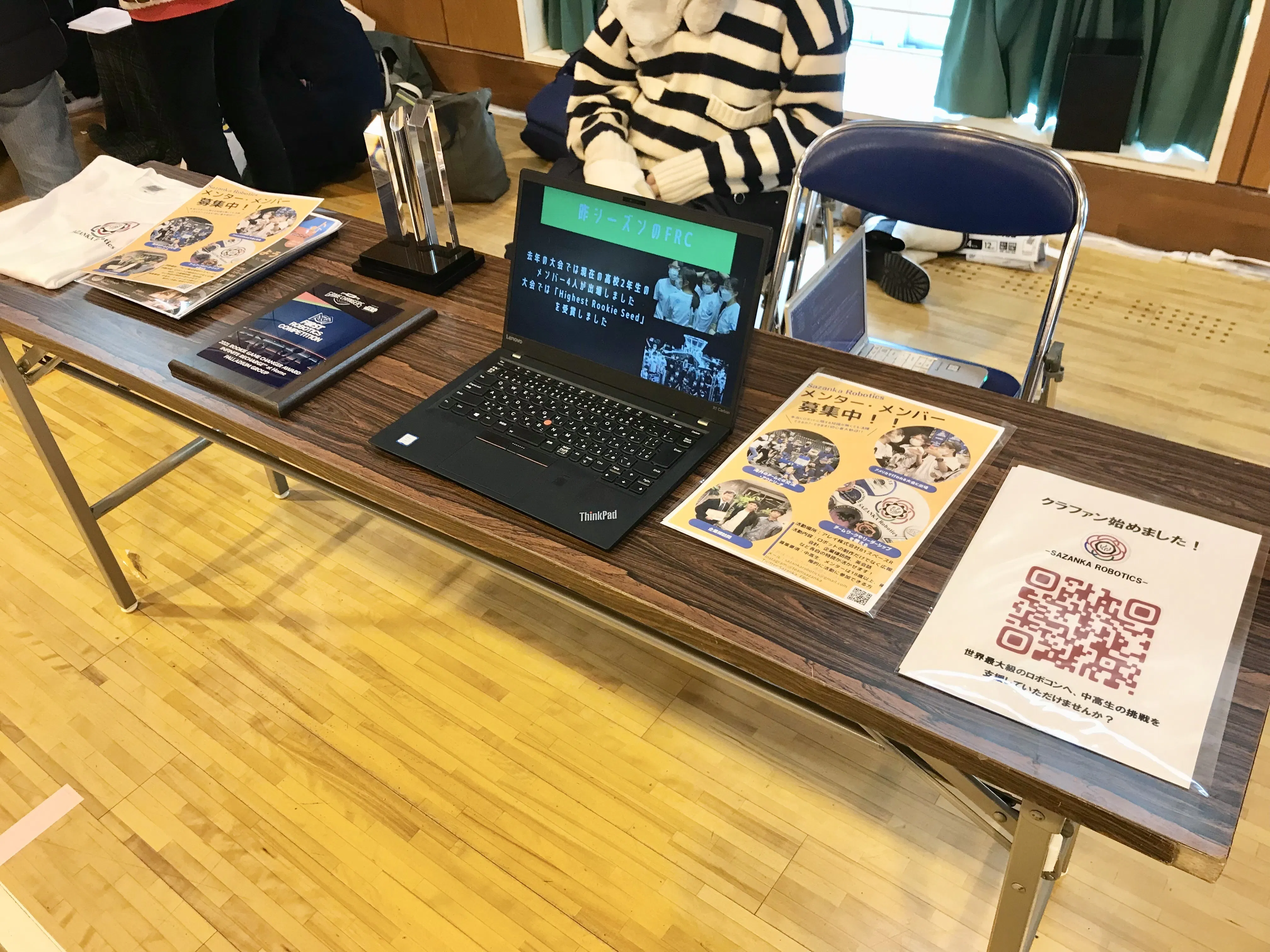 小中学生を対象とした競技会なので、競技には参加していないのですが、私たちの出場するロボットコンテスト(FRC)のブースを設けていただき、SAZANKA Roboticsの紹介等をしました。