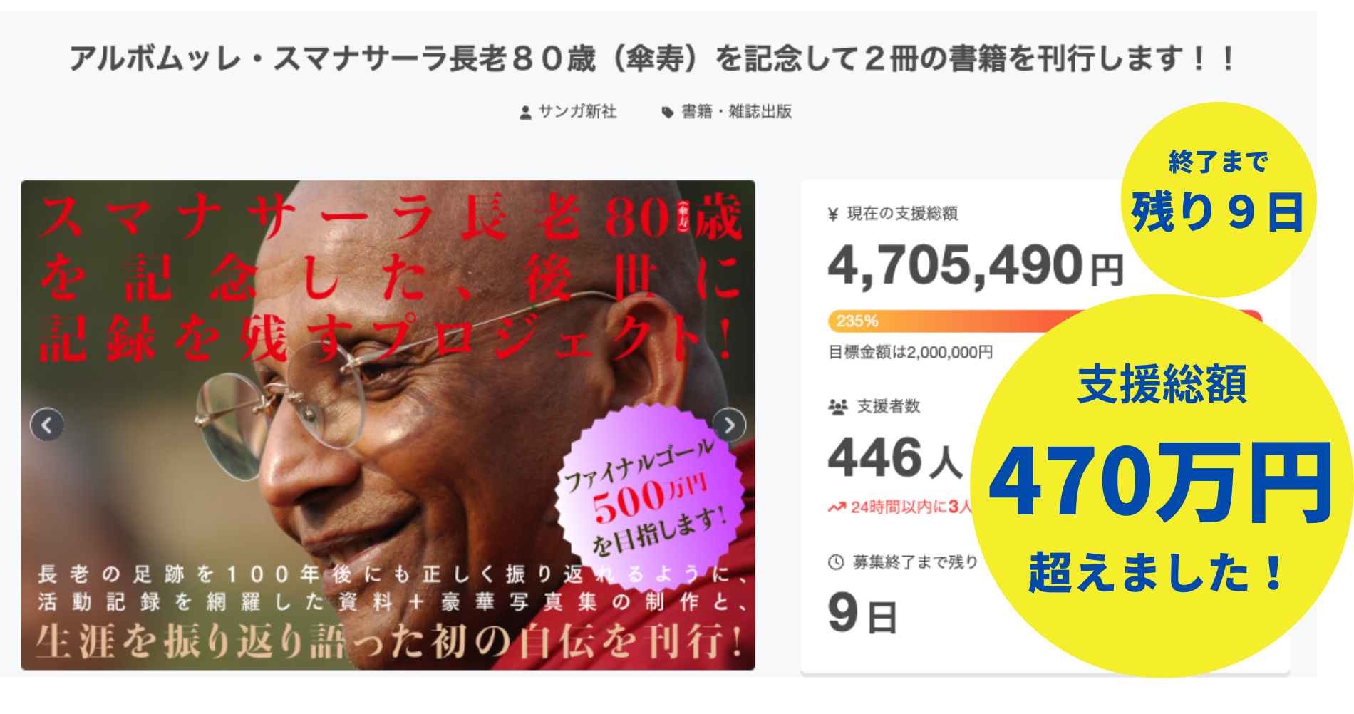 「アルボムッレ・スマナサーラ長老80歳(傘寿)を記念して2冊の書籍を刊行します!!」クラウドファンディングプロジェクトは、2月19日(水)に支援総額470万円を突破しました!