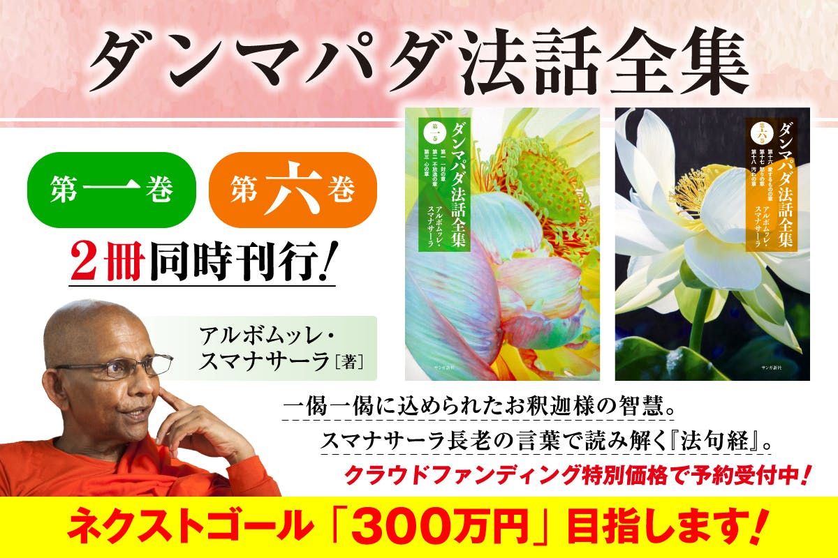 そして現在、サンガ新社では、スマナサーラ長老の『ダンマパダ法話全集』の『第一巻』と『第六巻』の刊行を目指すクラウドファンディングを実施中です!