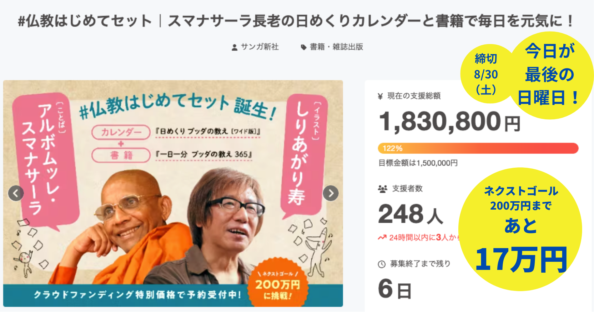 【締切8月31日(土)23:59】#仏教はじめてセット|スマナサーラ長老の日めくりカレンダーと書籍で毎日を元気に!⇒ https://camp-fire.jp/projects/779360/view最終日前日の8月30日(金)に「ネクストゴール200万円」達成しました!「#仏教はじめてセット|スマナサーラ長老の日めくりカレンダーと書籍で毎日を元気に!」クラウドファンディングは、目標金額150万円を突破しながらも、さらに多くの方々に仏教の力をお届けしたいという想いから、ネクストゴール「支援金額200万円」を掲げて活動を続けてきました。そして最終日前日の本日8月30日(金)に、ネクストゴール200万円に到達することができました!!応援をしてくださった皆さんの想いをありがたく受け止めています。本当にありがとうございます! 皆さんの力によって実現できた成果です今回のクラウドファンディングは、サンガ新社の創業時から、取り組みたいと考えていたプロジェクトです。サンガ新社は「仏教の智慧をもっと身近に」というビジョンをもって事業に取り組んでいます。その中で、皆さんが親しみをもってご愛用されている『日めくりブッダの教え』は、まさに仏教の智慧を身近なものとして届けるために、なくてはならない作品でした。しかしながら、在庫がなくなってしまった『日めくりブッダの教え』は、再刊行の制作費も割高な部分があり、取り組むのが難しい商品です。「皆さんのお力添えをいただければ、なんとか再刊行できるかもしれない」と考えたものの、どれくらいの方々から共感をいただけるのか、とても不安でした。それでも、思い切って一歩踏み出し、プロジェクトをスタートしました。すると光栄なことに、ご愛用いただいてきた方々より温かいご推薦のメッセージをたくさんいただき、じわじわとご支援の輪が広がっていくことを感じました。それによって、新しい読者の方々にも、スマナサーラ長老の作品の魅力を伝えることができています。サンガ新社だけでは実現できないことが、皆さんの力によって、こうして実現できているのです。今回の『日めくりブッダの教え』と『一日一分ブッダの教え』のリニューアル復刊は、皆さんの力によって実現できた成果です。本当にありがとうございます!これからもスマナサーラ長老の智慧をできるだけ多くの方々に届けるために、サンガ新社は出版社としての大切な役割をしっかりと担っていきますので、あらためてよろしくお願いいたします。「2024年8月31日(土)23:59」が最終締切です7月20日(土)から実施してきました「#仏教はじめてセット|スマナサーラ長老の日めくりカレンダーと書籍で毎日を元気に!」クラウドファンディングも、いよいよ明日、「2024年8月31日(土)23:59」が締切となります。お得な事前予約期間もこの日までです。クラウドファンディングとともに駆け抜けた2024年の暑い夏も、いよいよ終盤を迎えることになります。多くの方々が、スマナサーラ長老としりあがり寿さんの「#仏教はじめてセット」に出会うために、最後までご支援をどうぞよろしくお願いいたします。【締切8月31日(土)23:59】#仏教はじめてセット|スマナサーラ長老の日めくりカレンダーと書籍で毎日を元気に!⇒ https://camp-fire.jp/projects/779360/view