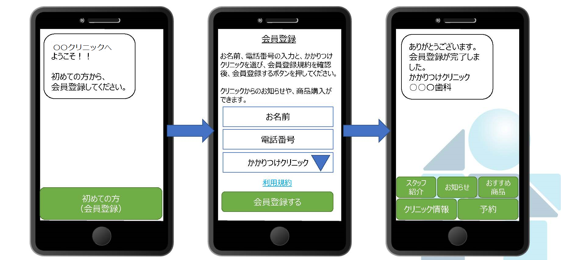 など、ユーザーはスマートフォンで簡単にクリニックを探すことができて、気に入ればかかりつけクリニックとして登録すればさらに便利に!