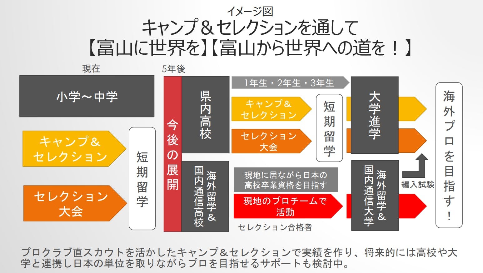 私たちの事業は、私たち独自のコネクションと、私たちにしかできないプランで第2.第3の世界に羽ばたく選手をこの富山から輩出してみせる!といった確固たる決意の元進めております。このプロジェクトが成功した先には、進学と留学を両立したプロへの新しい道を作ることが望みです!将来的には、教育機関と連携し、保護者の皆様にも安心して子供を送り出せるよう、【留学しながら日本の教育カリキュラムを得られるシステム】を構築していきたいと思っています。