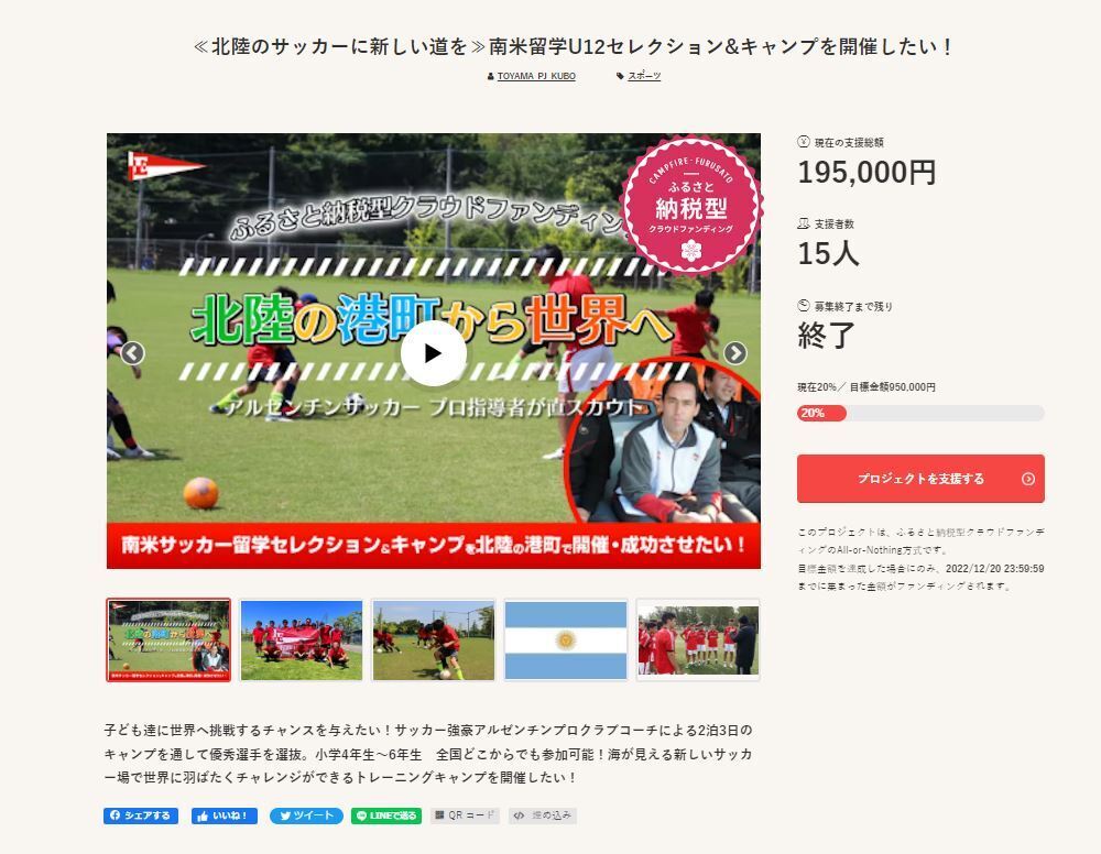 2022/12/21 00:10この度≪北陸のサッカーに新しい道を≫南米留学U12セレクション&キャンプを開催したい!と題してクラウドファンディングに挑戦させて頂きました。結果20%でこの挑戦は失敗となりました。ご支援・ご協力いただいた皆様には良い報告が出来ず申し訳ありませんでした。一旦このプロジェクトは取り下げさせて頂きます。最後にプロジェクトを推薦していただいた富山県様ページ作成にお付き合いしていただいたCAMPFIRE様リターン品の提供協力していただいた企業様ありがとうございました!この挑戦を糧にまた地域の活性化に邁進させていただきます。 もっと見る