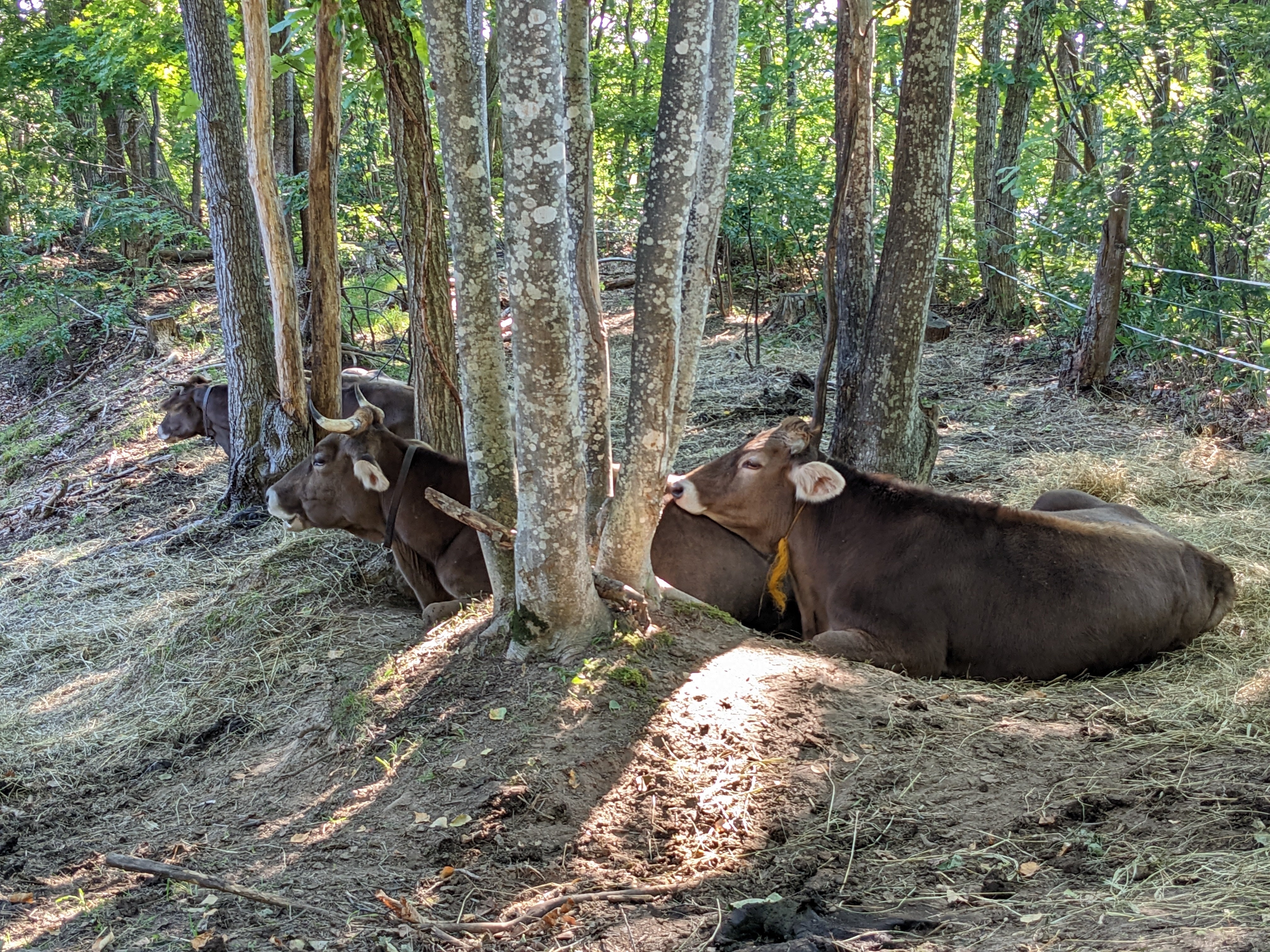 焼き菓子ダーチャのお菓子の販売・牛ののんびり放牧風景・焚き火・ツリーテラスなどの森あそびが同時に楽しめる