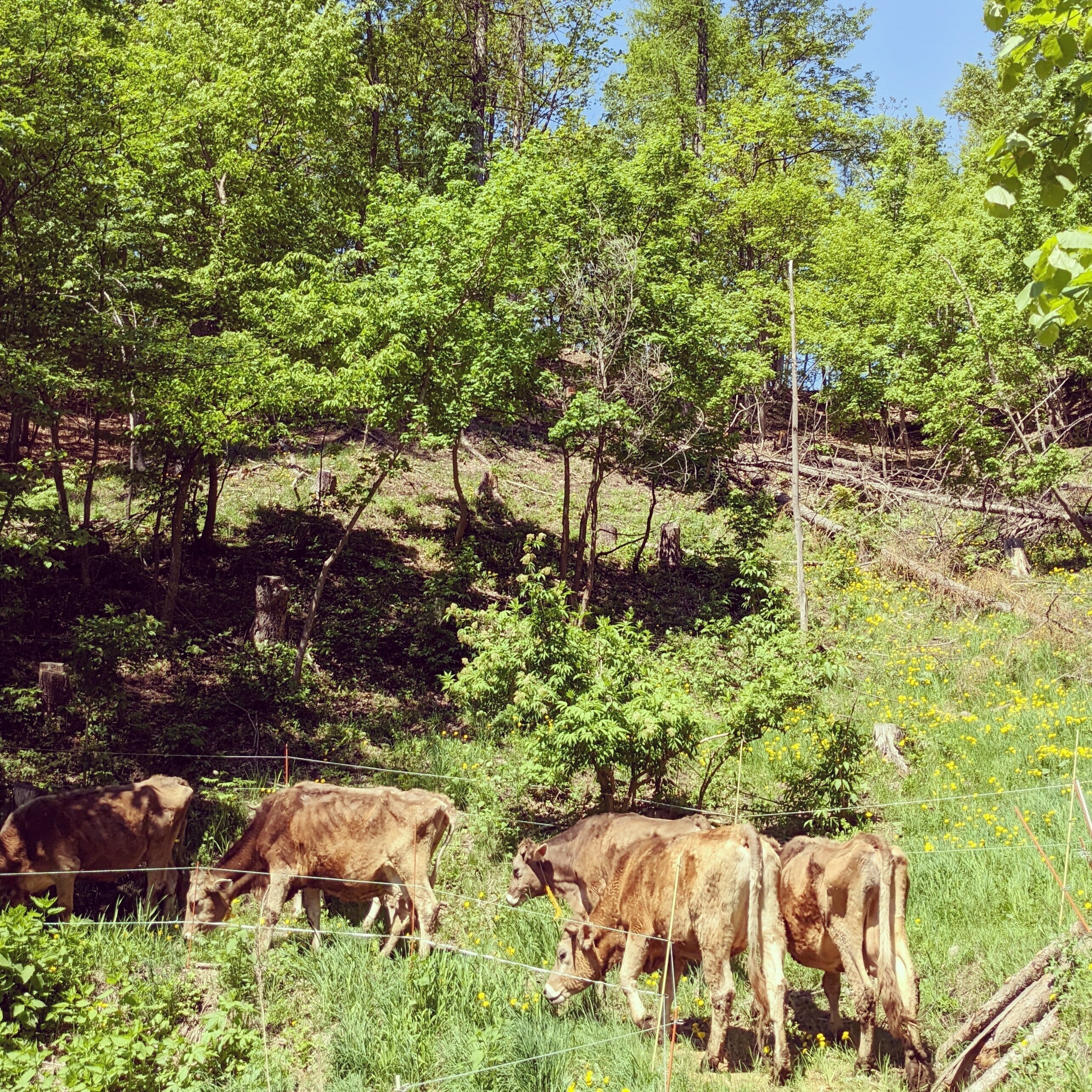 焼き菓子ダーチャのお菓子の販売・牛ののんびり放牧風景・焚き火・ツリーテラスなどの森あそびが同時に楽しめる