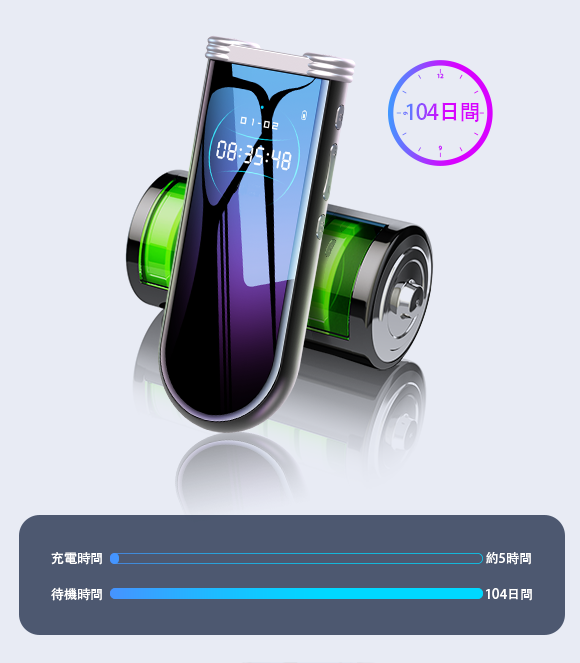 「Q95」はコンパクトながら1100mAhの大容量バッテリーを搭載しており、録音モードは6.5h、録画モードは6h稼働可能です。さらに、待機状態では驚きの104日間持続可能です。さらに、充電しながら使用可能なので、モバイルバッテリーに接続しながら使用すれば記録中の電源切れの心配はありません。