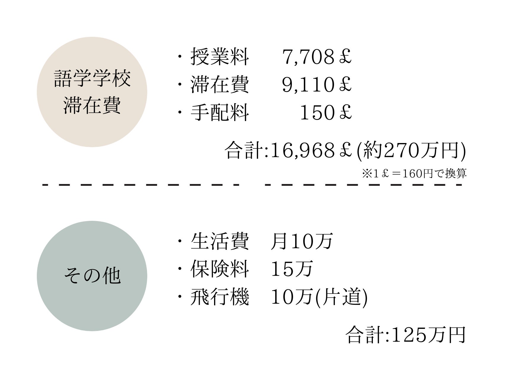 費用は約270万円、その他生活費などで125万円程度かかる想定です。語学学校と滞在費以外の部分は、自分で貯めたものと両親に少し協力をお願いし、工面するつもりです。