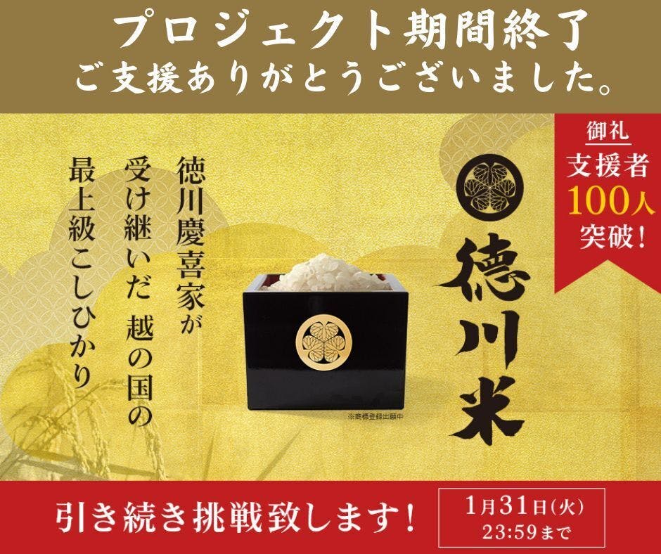 1月31日(火)23:59をもって#德川米Project のクラウドファンディングプロジェクト実施期間が終了致しました。