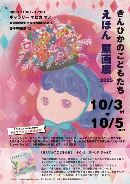 2025/09/17 16:38まだまだ暑い日が続いておりますが、皆様お元気でしょうか?原画展のお知らせです。前回のお知らせでは吉祥寺のギャラリーマヒカマノでの原画展は9月の予定とお伝えしておりましたが、10月3日(金)4日(土)5日(日)に開催されることとなりました。予定を入れておいてくださった方には日程が変更して大変申し訳ありませんでした!!展示詳細です。「きんぴかのこどもたち 原画展」日時 10月3日(金)4日(土)5日(日)11:00〜17:00【※ライブペイント&ライブパフォーマンス 10/4日(土)11:00〜12:00】場所 ギャラリーマヒカマノ(吉祥寺駅徒歩4分)〒180-0003 東京都武蔵野市吉祥寺南町2-8-1 サンパレス1F今回はなんとサプライズでライブペイントを行うのですが、大好きなミュージシャン「おととことばこ」さんも参加してくださることになりました!魂と繋がって音色のような美しい声のおととことばこさんとギターが、私のライブペインティングと交わって、この時この瞬間にしか生まれない作品をお届けできたらと思います。絵本の読み聞かせも行なってくださいますので、大人から子供まで楽しめる時間になると思います。入場料はフリーです。私もとっても楽しみ!ぜひ遊びにいらしてくださいね。涼しいといいな。 もっと見る【御礼】テレビ放送、個展等のお知らせ