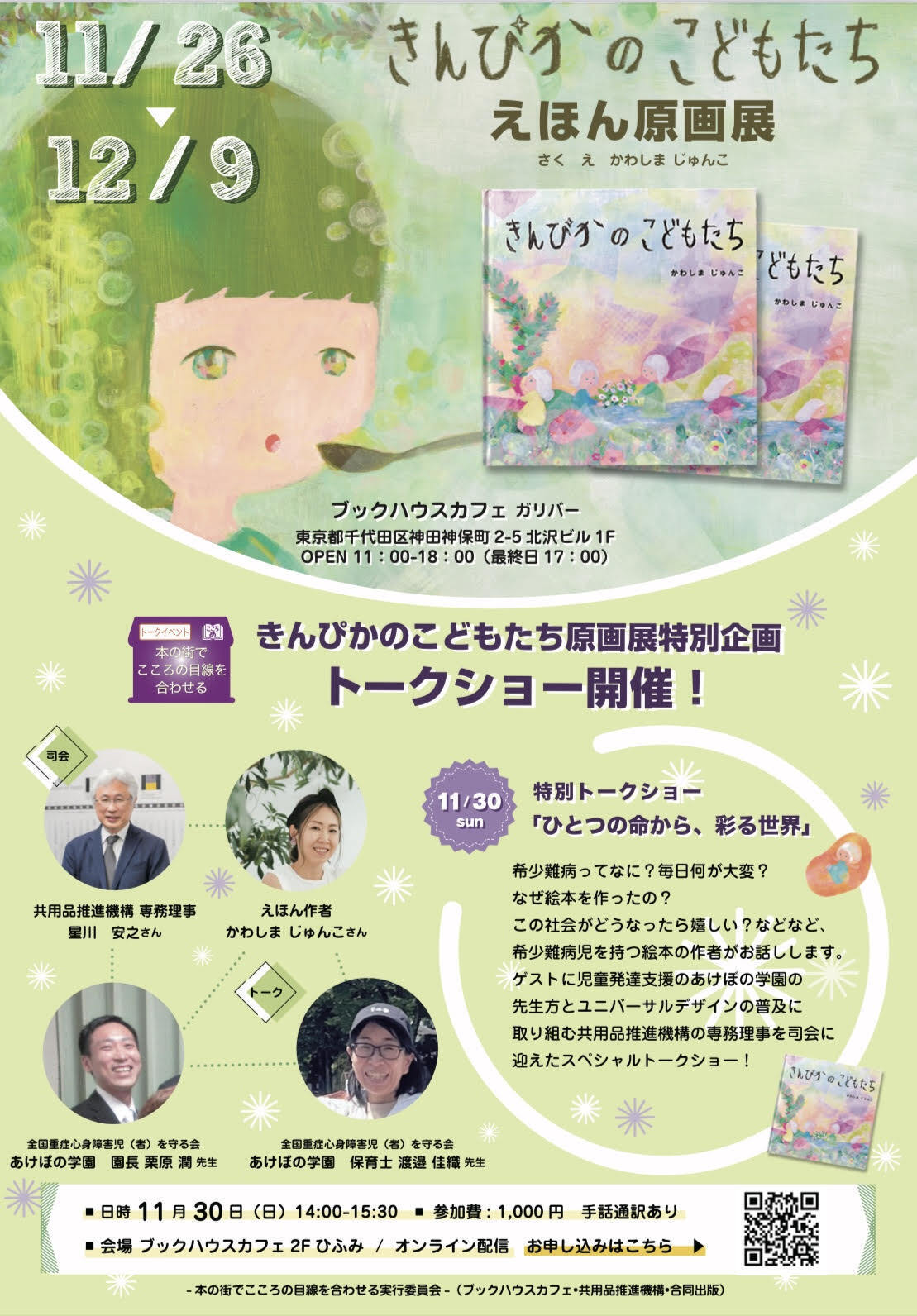 2025/11/12 14:01こんにちは!今年最後のビッグイベントのお知らせです!神保町の絵本専門店、ブックハウスカフェにて原画展&特別企画トークショーが開催されます!11/26-12/9ブックハウスカフェのカフェギャラリー、ガリバーにて絵本の原画展を開催!ブックハウスカフェ アクセスはこちら >>11/30(日)14:00〜15:30にトークショー開催!ブックハウスカフェ2階にて!※同時手話通訳ありトークショーお申し込みはこちら >>トークショーについて今回福祉の世界で著名な方々をゲストに登壇することとなりました。司会の星川さんは、身近にある、シャンプーのギザギザや、牛乳パックの凹みなど、ハンディキャップを持った方々が便利に暮らせるよう商品を開発されている共用品推進機構の専務理事です。タカラトミーで障がいを持つ子供たちのためにいち早く玩具を作った方としても有名です。そして次女がお世話になっている、全国に支部があり歴史のある「重度心身障害児(者)を守る会、あけぼの学園」の園長先生と、保育士さんにも来ていただきます。保育士さんの読み聞かせもお楽しみに!子供のこと、生活のことなど、質問されたら喜んでお話しするけど、そういう機会って意外となくて。今回は次女が生まれた時のことから、絵本を作るきっかけや、想い、仲間のこと、幸せの連鎖が続いていること、社会について、などいろんなことをお話しできたらと思います。打ち合わせの段階で感動して泣きました。笑自分の人生に感動して涙する体験があって、いいなと思う瞬間でした。辛いことがあっても、あの時は大変だったよ〜と未来の自分が笑い飛ばしてくれるで、大体のことはだいじょうぶなもんだなと思うのでした。そして、私の周りは大人たちもみんなきんぴかです。支えてくださるたくさんの方々に、感謝の気持ちでいっぱいです!ありがとうございます!最後に。わが家は海と山のある自然たっぷりな土地に、来月移住することになりました。駐車場や店舗もどこも広くて車椅子でスイスイ。医療も看護もそこそこ充実しています。(必須項目)クマも出ないし災害区域でもなく、縄文土器が出た素敵な土地で、初めてそこに行ったときに、ここに住むんだとすぐわかりました。いろんな場所を見に行きましたがどこもピンとこず、決めた土地に入ったら「ここだ!!」と。面白い体験。都内までのアクセスもよく便利ですが、今後はなかなか今のようには出向く機会は減るので、ぜひ今回トークショーに来て私と会ってください!!移住のお話もしまーす。トークショーお申し込みはこちら >>ブックハウスカフェ アクセスはこちら >>あとがき前回の吉祥寺での個展に行ったライブペイントのこと。これまで数えきれないほどライブペイントをしてきたのですが、今回は自分でも初めての感覚で、ギャラリーが光に包まれお客様が涙する神聖な空間となりました。びっくりびっくりでした。演者も観客も誰も欠けてはならない、皆様で作り上げた素晴らしい空間に、何度も感動しました。ミュージシャンの方々が本当に素晴らしくて。お付き合い頂きありがとうございました! もっと見る