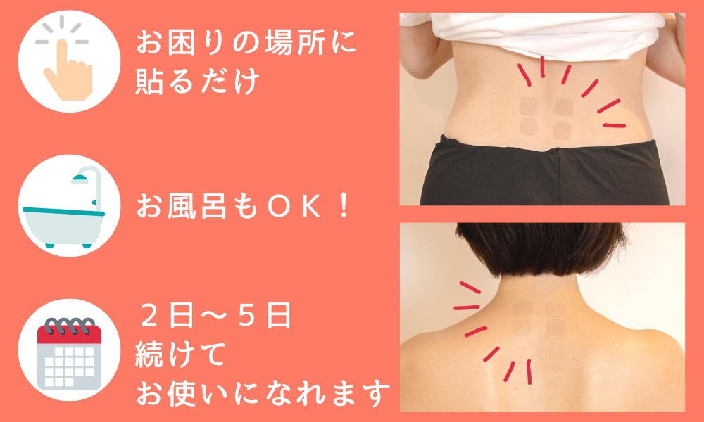 貼ったままお風呂に入っていただいても大丈夫!効果はなくなりません。2日間~5日間ほど、貼ったままお過ごしいただけます。あまり長期間ご使用になりますとシールによるかぶれなどが心配されますので、かゆみを感じたら剥がしてください。
