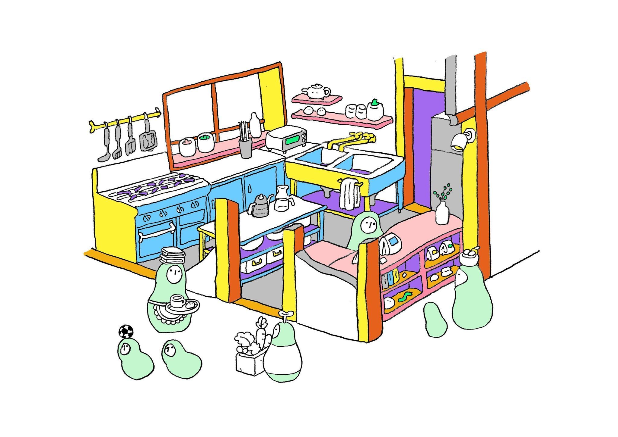 あそび場、ご飯処、日用品のお店であり産直でもあるようなシェアカフェイメージ。イラストを描いてくれたのは、今年真田町に移住してきたてんこまつりさん。