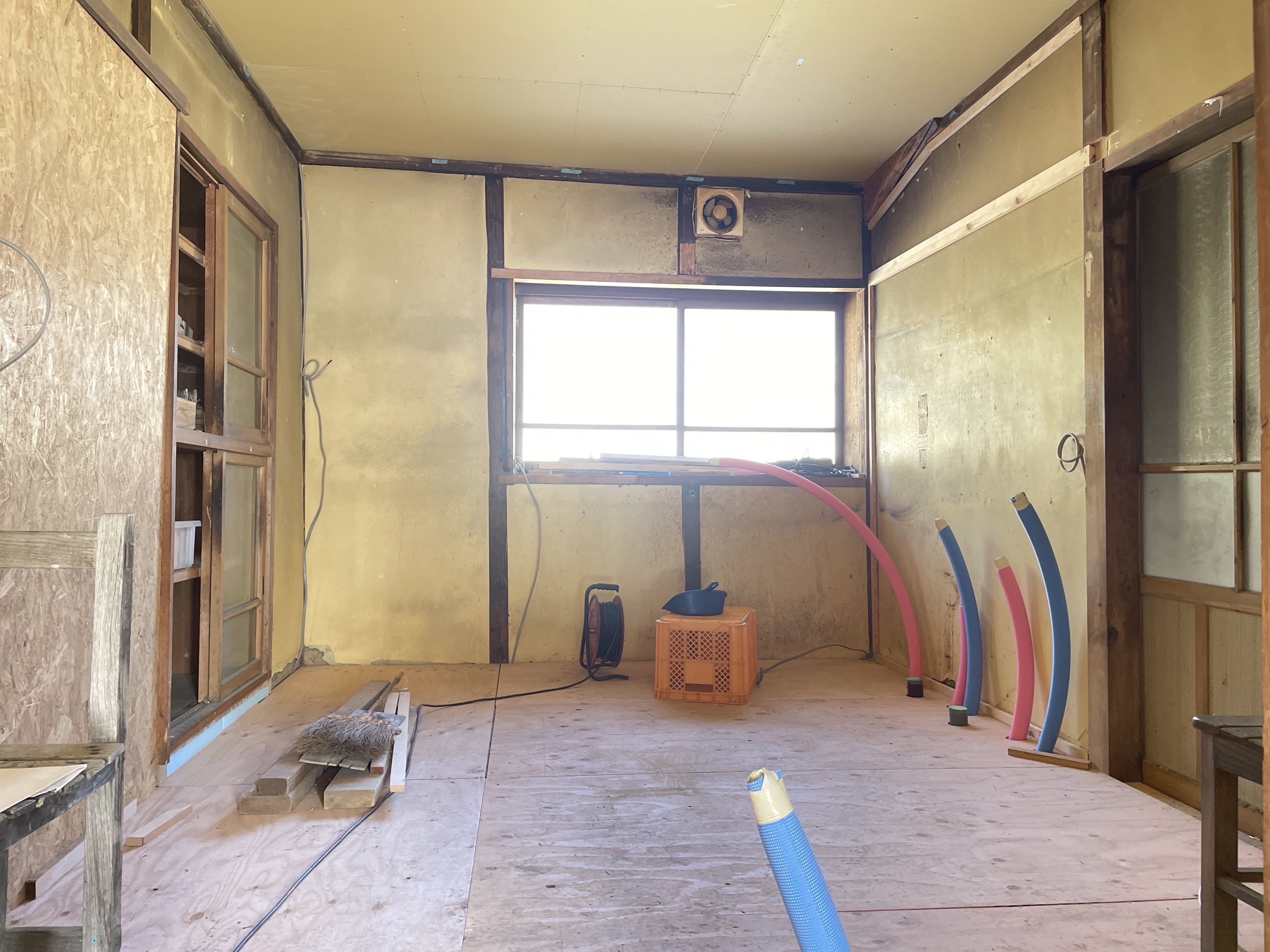 水道と電気、床の下地、天井貼りが完成しまして、次は壁に取り掛かります!