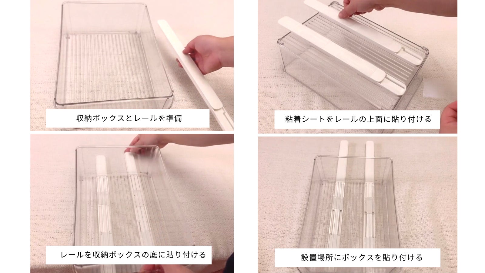 ② 収納ボックスの底面にレールが平行になるように貼り付けます。