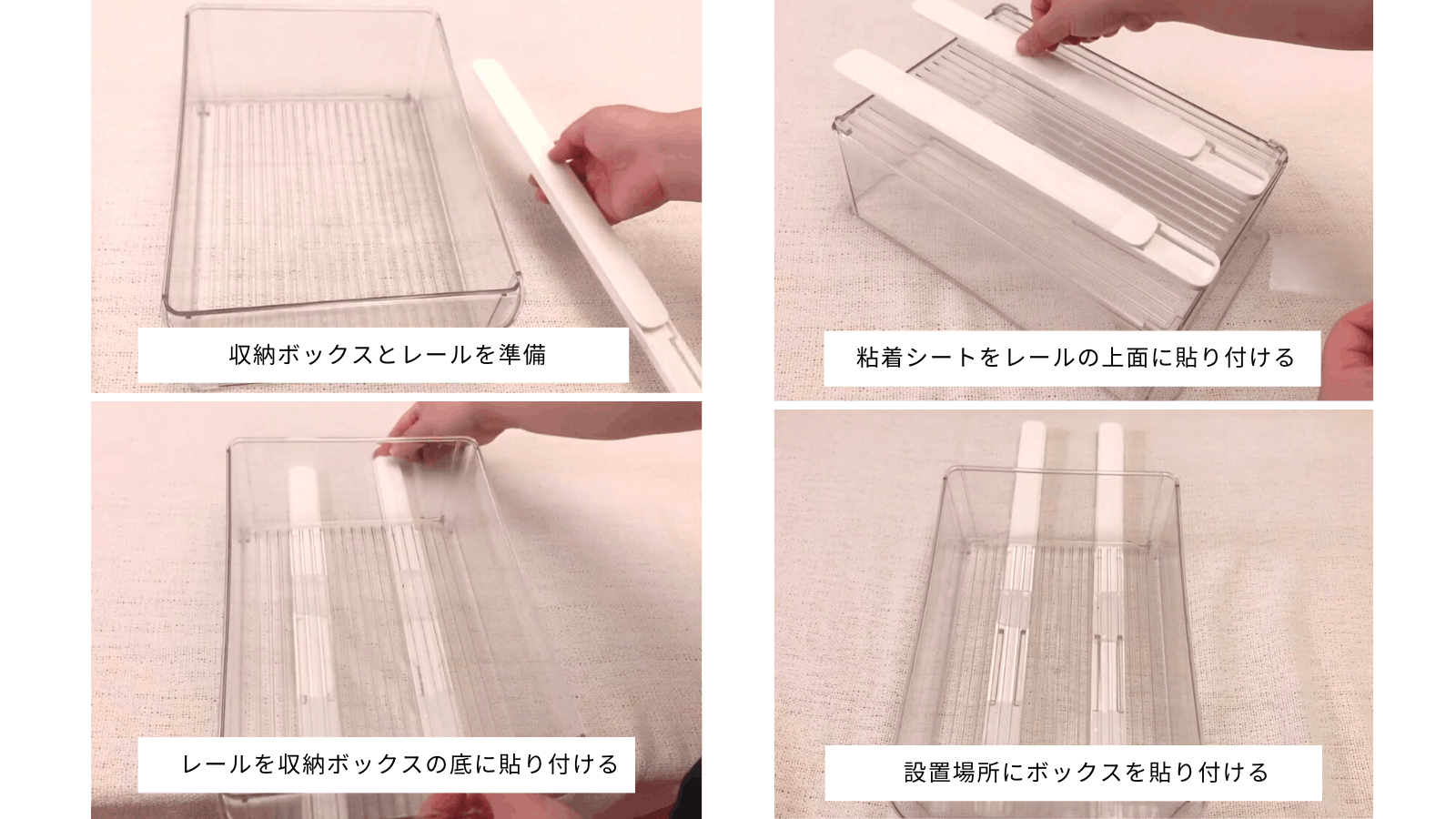 設置も簡単。レールを取り付けたいBOXの底面に平行になるように貼り付け、反対側のシールを剝がしたら、あとは取り付けたい場所にピタッと貼り付けるだけ。