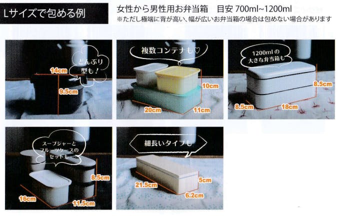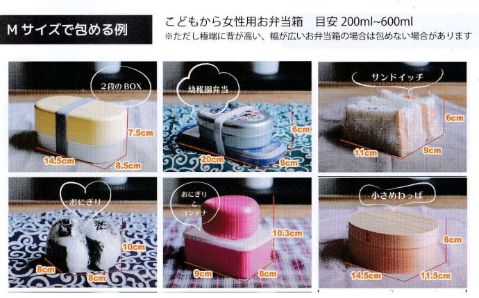 質問:Мサイズ・Lサイズのランチクロスがありますがどれくらいの大きさのお弁当箱が包めますか?