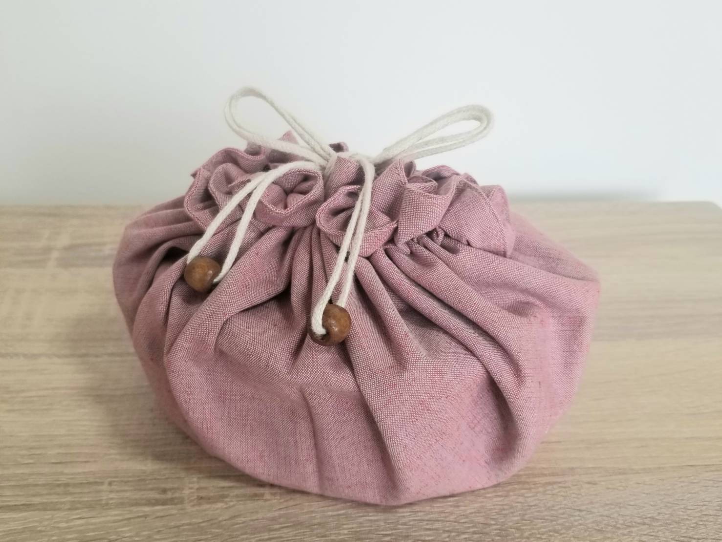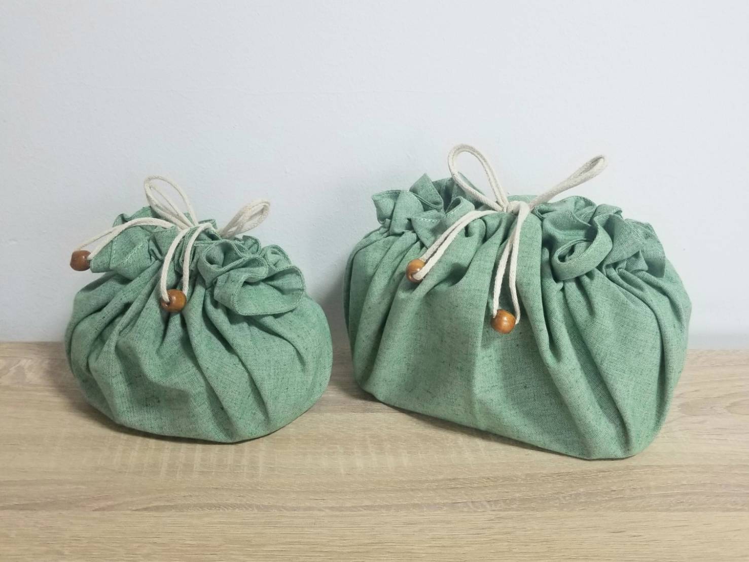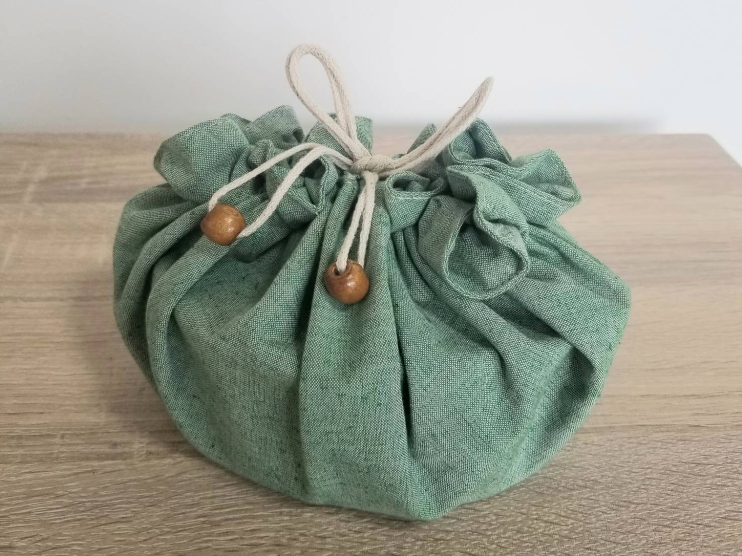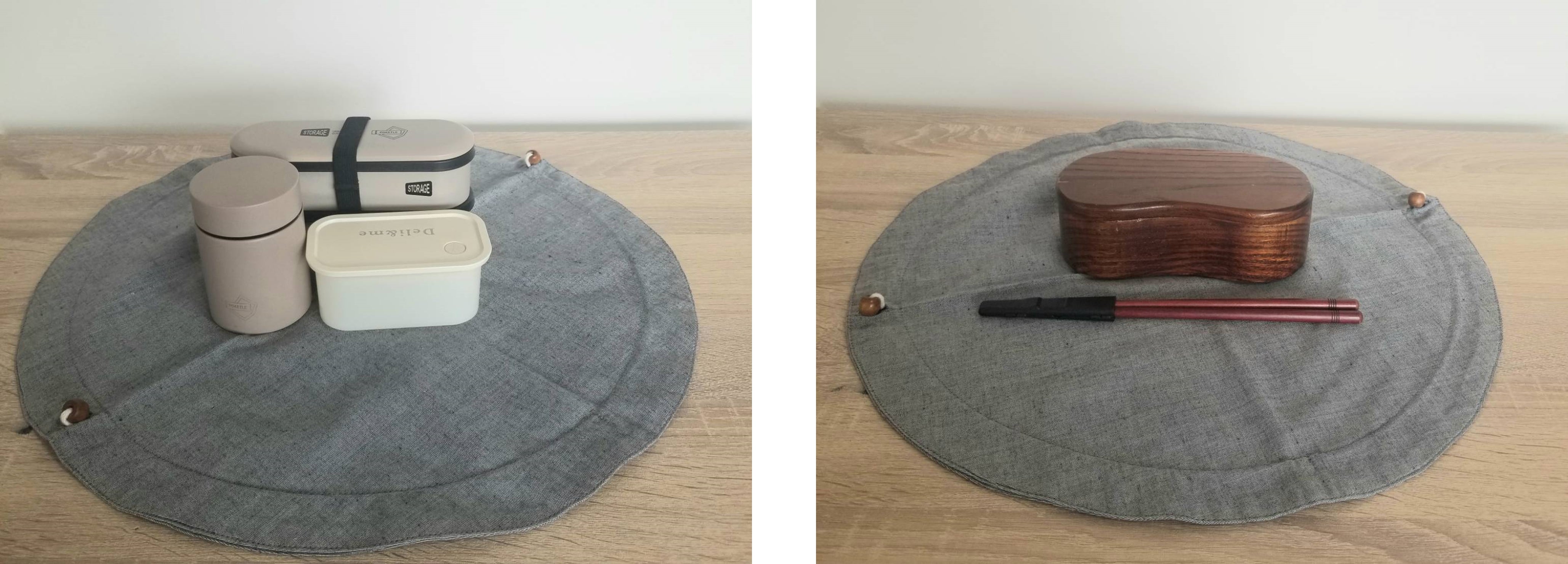 紐を引っ張り結ぶとお弁当袋に早変わり、ありそうでなかった1枚2役のランチクロス兼お弁当袋です。