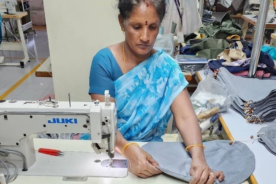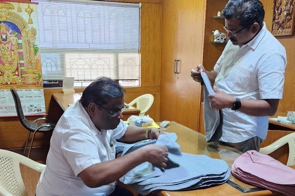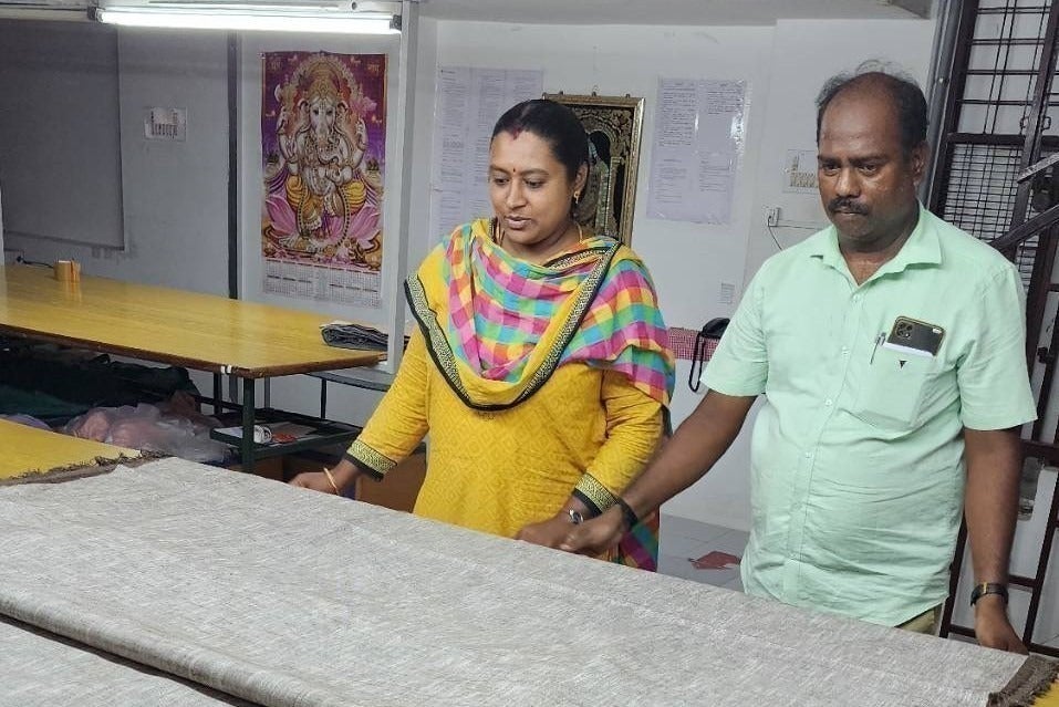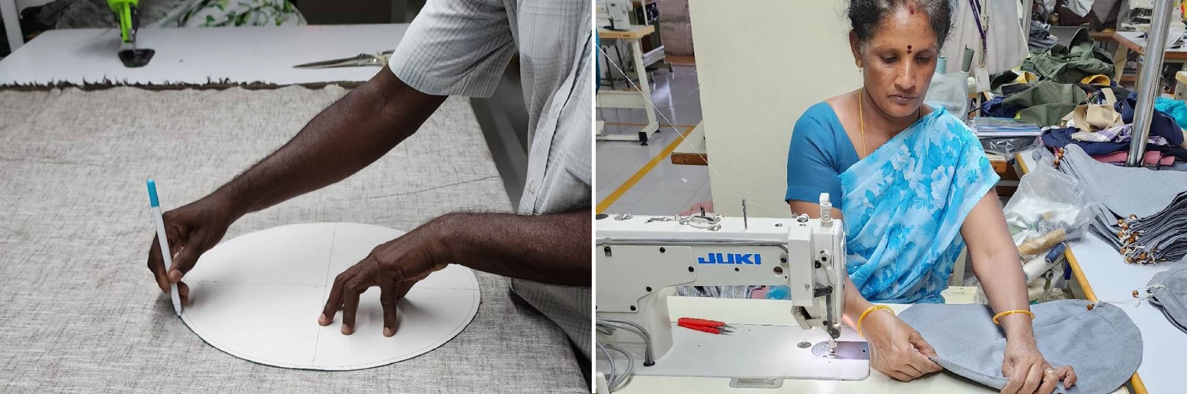 (南インドはヒンドゥー教を信じる地域、カースト制にて糸を染める人から生地を織る人、工場内でカットする人