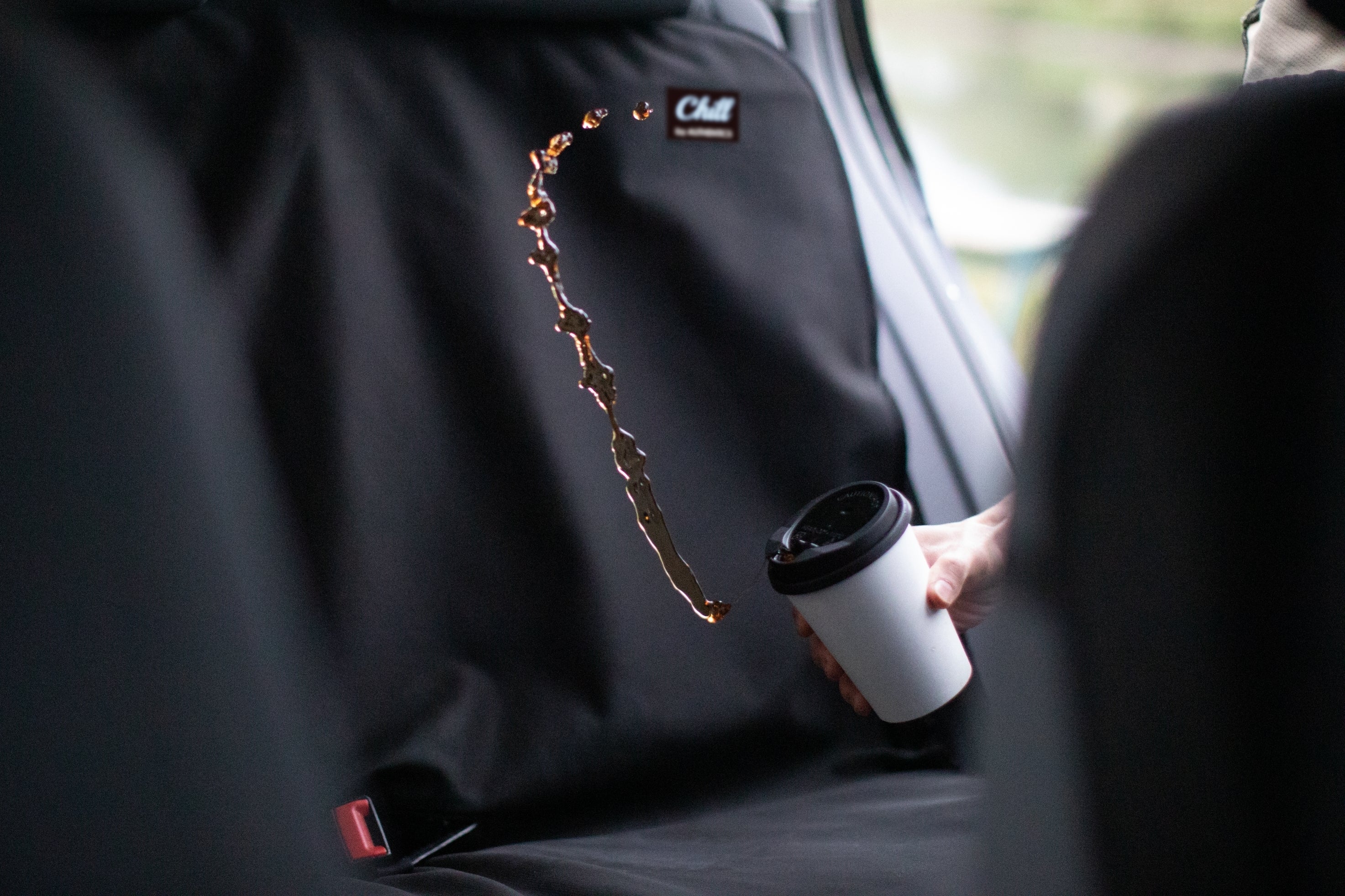 Chillシートカバーは三層構造になっており、万が一コーヒーをこぼしても表面〜中間層で完全にブロックして車両のシートへ水分を通しません。