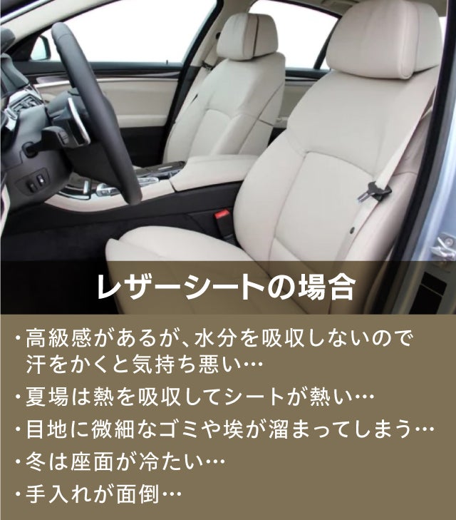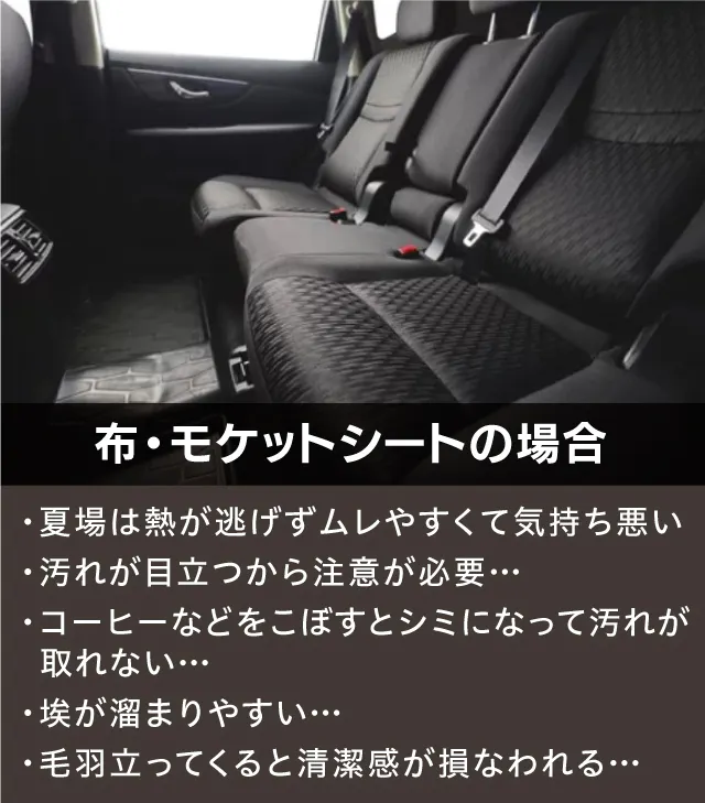 車のシートにはレザーシートから布シート・モケットシートなどがあり、それぞれに一長一短があります。