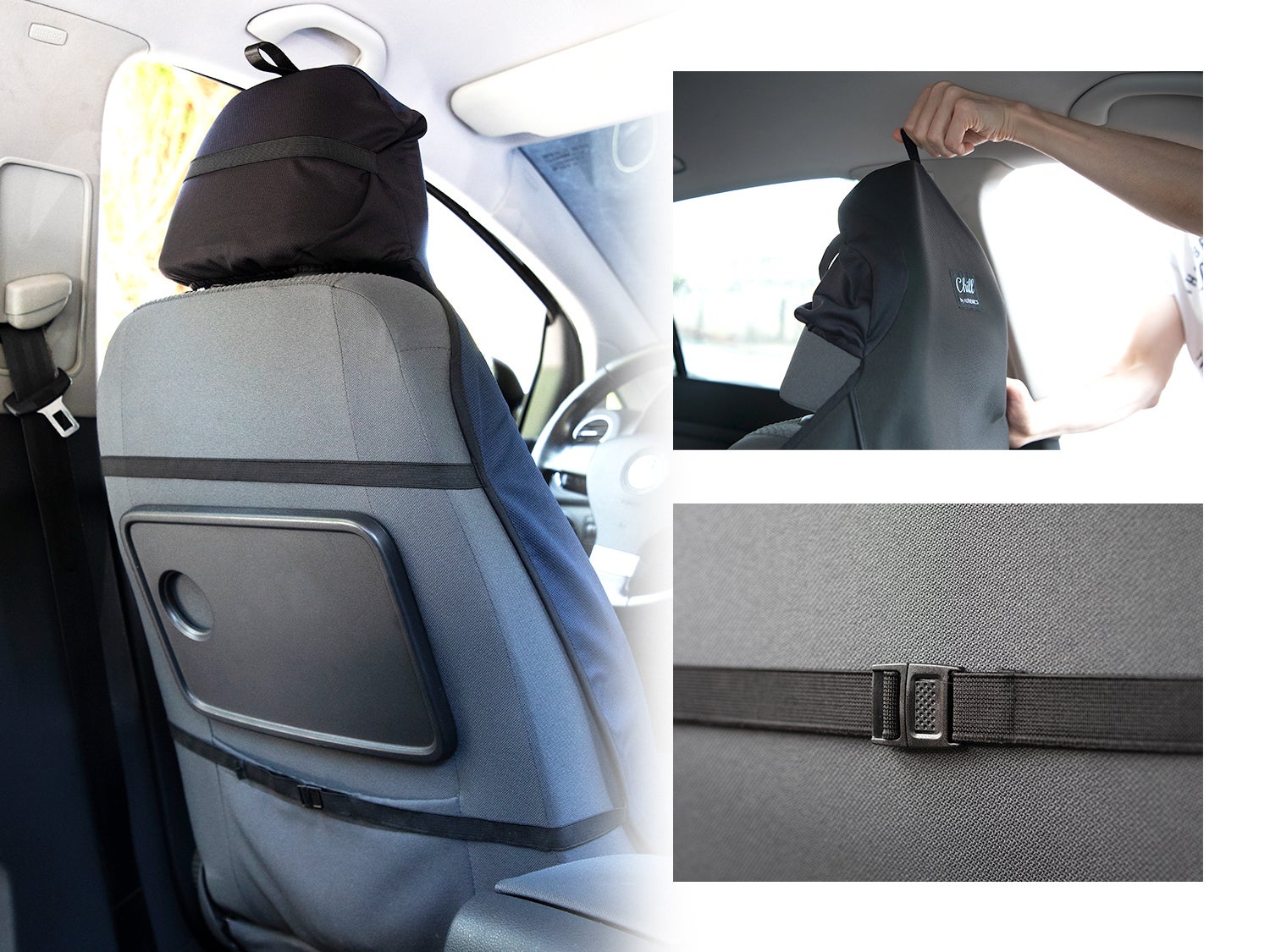 Chillシートカバーに直接くっつけて必要な時だけ好きな位置に固定することが可能です。