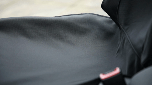 フロントシートカバーの背もたれ部は上下2本のバンドでしっかり固定。