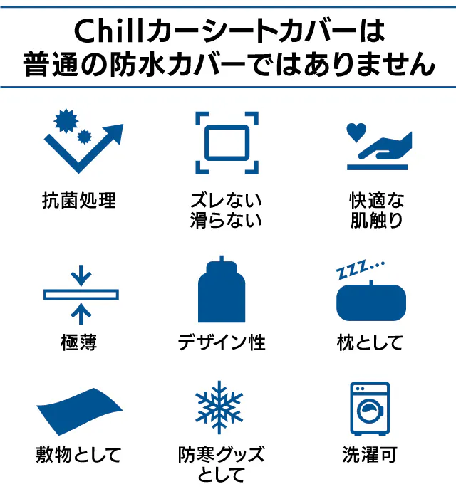 肌にやさしい生地で心地よい質感のChillシートカバーは夏の座面から伝わる熱気を抑えて汗むれを防止し、冬もシートが冷たく感じることはありません。
