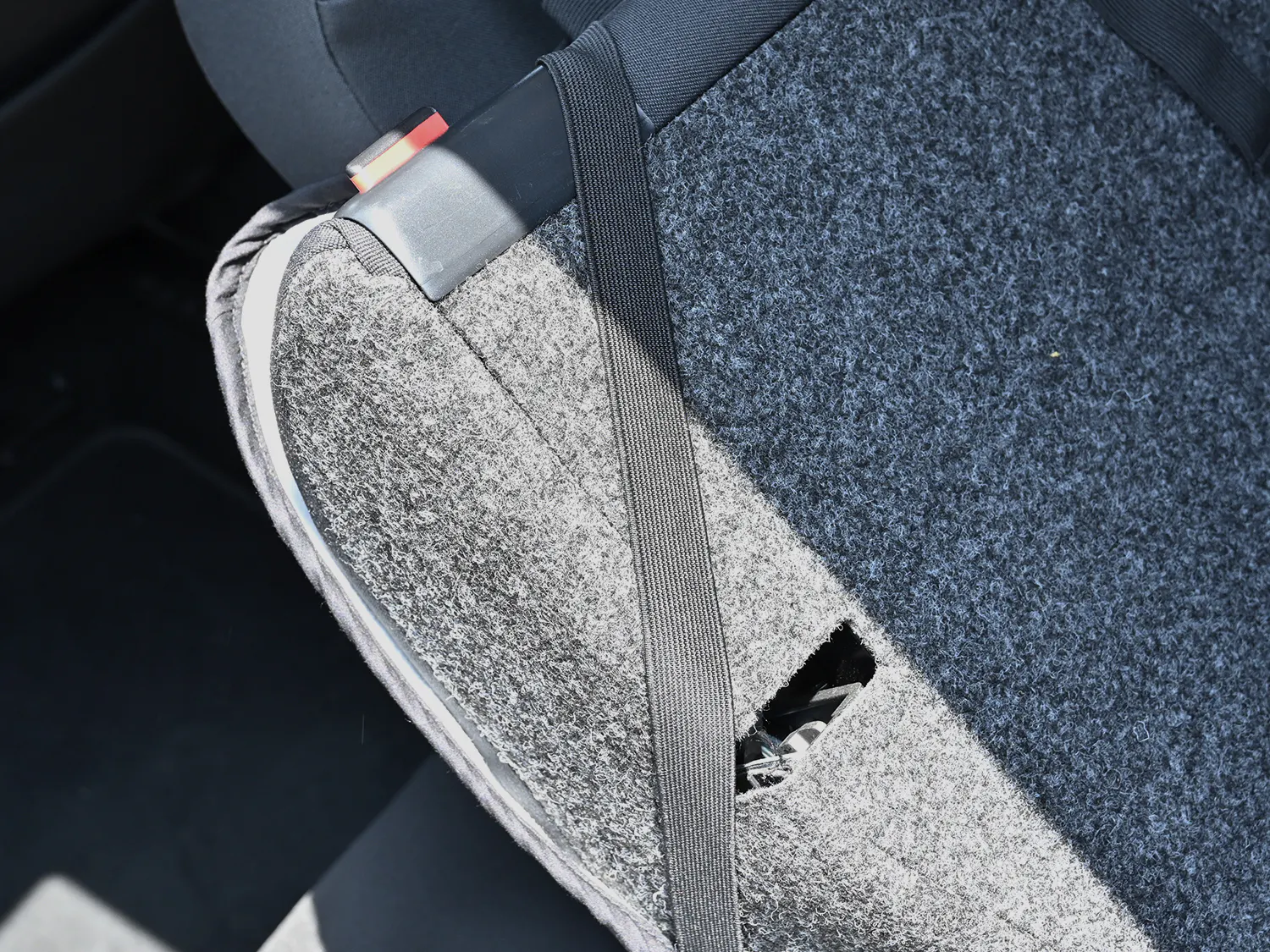 リアシートカバーはシートベルトバックル取り出し口が必要ですが、ただ開口部があるだけでは完全ブロックを実現できません。