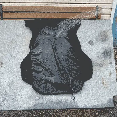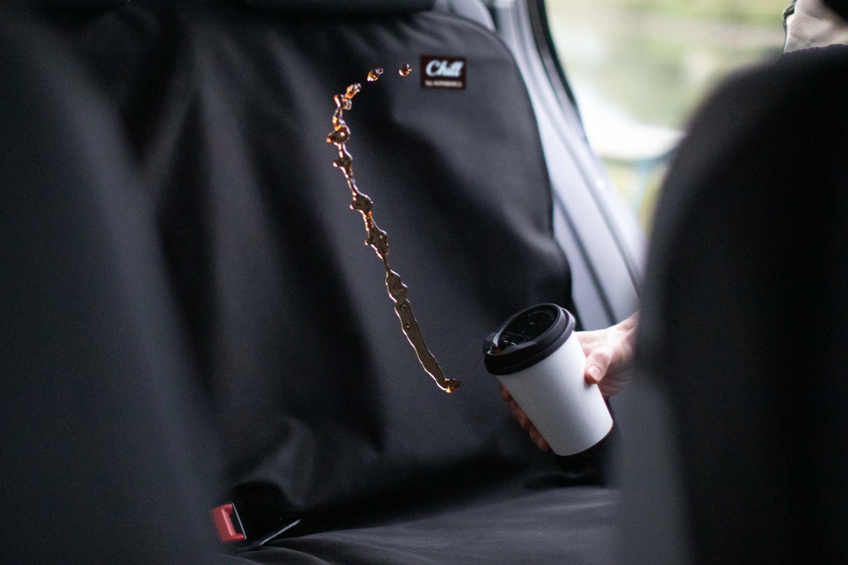 Chillシートカバーは三層構造になっており、万が一コーヒーをこぼしても表面〜中間層で完全にブロックして車両のシートへ水分を通しません。