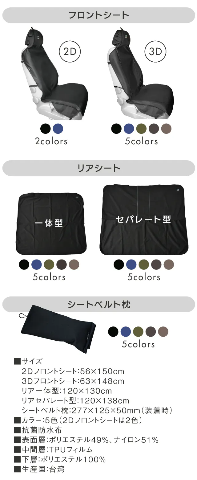 台湾の優れたテキスタイル技術を採用し、「防水・簡単装着」で高品質・高機能、車両固有の雰囲気を損なわず「首枕・腰枕」にも変身できる、乗る人にもフォーカスした多機能の汎用カーシートカバーです。