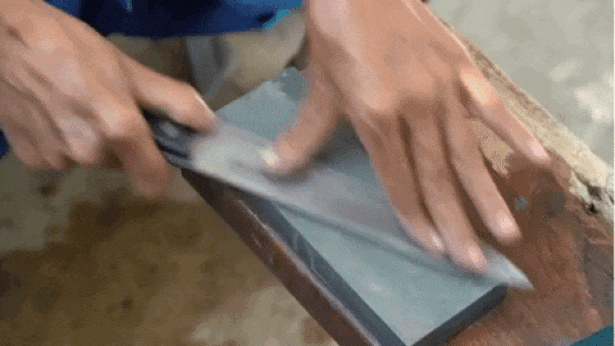 ただし、特に両刃の包丁のように刃の面積が小さい場合、その包丁の元々の刃付けが14°なのか16°なのか、その微差を見極めるのは困難です。故に、どんな刃も「15°に固定して研ぐ」ことが、安定的、且つ鋭い刃先を作るという目的を果たすために、最も合理的で、長い歴史で培った日本の研ぎの技術がそれを証明しています。