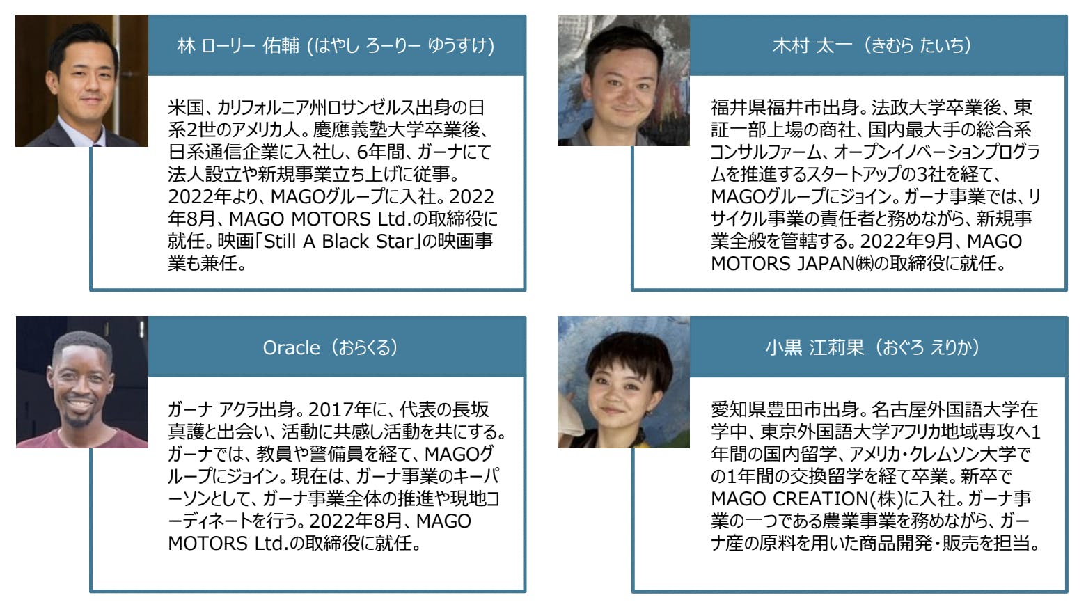 2017年11月にアグボグブロシーの玄関口にある小売店で当時警備員をしていたオラクルに長坂が偶然出会ったことがきっかけで始まりました。長坂は出会った瞬間から、オラクルには“この人はきっと人を裏切らない”という感覚を覚え、彼を信じることに決めました。オラクルに限って、不思議な感覚に包まれました。出会ってからもうすぐ5年が経ちますが、彼は現在ガーナにある我々のリサイクル工場のマネージャーとして働いてくれています。先日ガーナに設立した新会社の「MAGO MOTORS LTD」では、取締役として役員に任命しました。
